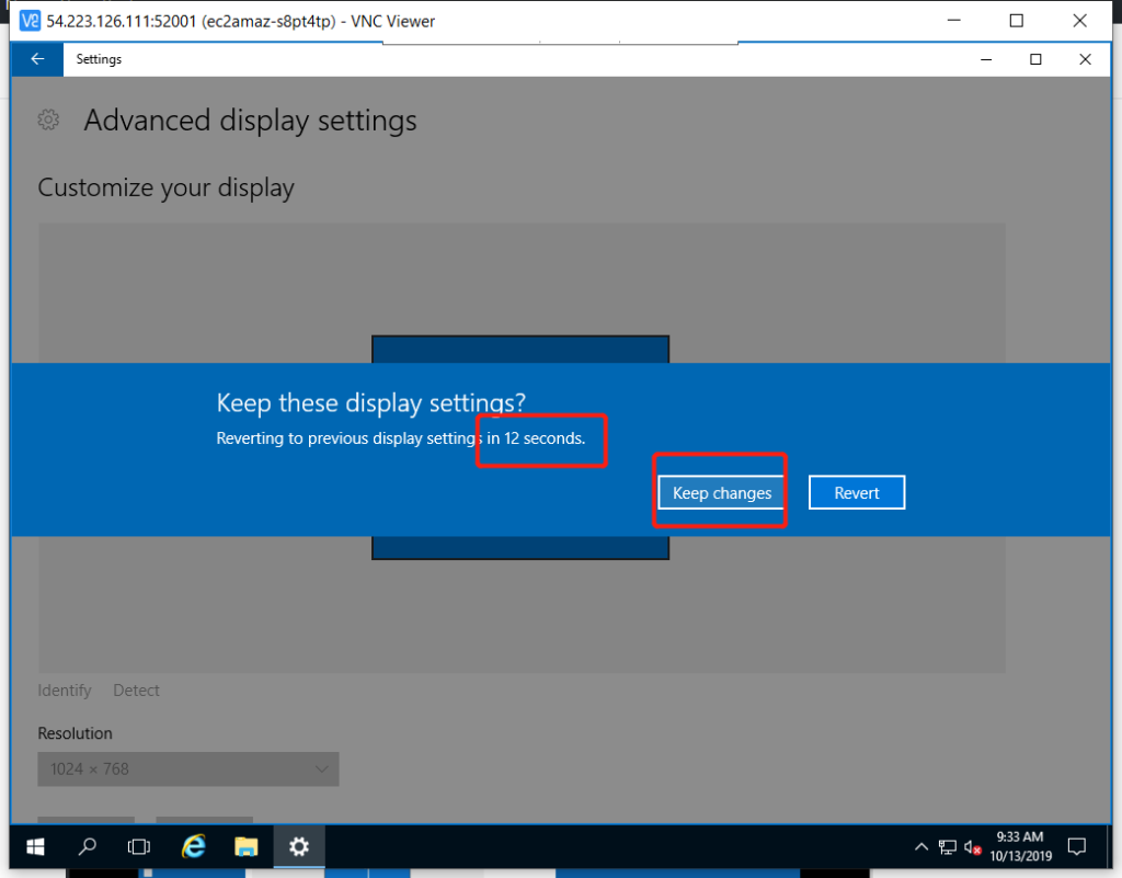 系统询问分辨率是否显示正常。正常的话就点击确认。如下截图。这一步在笔记本、台式机等PC机和图形工作站上常用的反悔步骤,因为调整过高可能显示器直接黑屏。VNC窗口不会有这个问题。直接确认分辨率修改。如下截图。