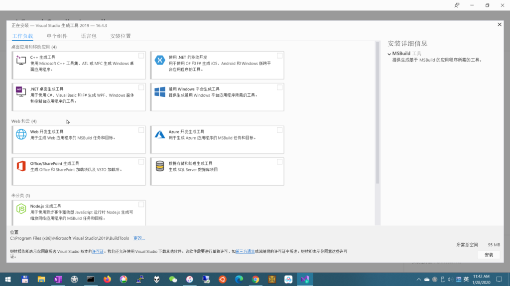 在弹出的安装窗口中,选择左上角第一个“C++生成工具”,然后安装。如下截图。