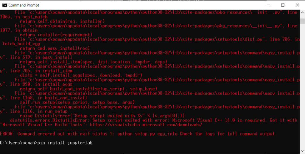 如果此时安装 jupyter会报告找不到VC++,报错现象如下图。