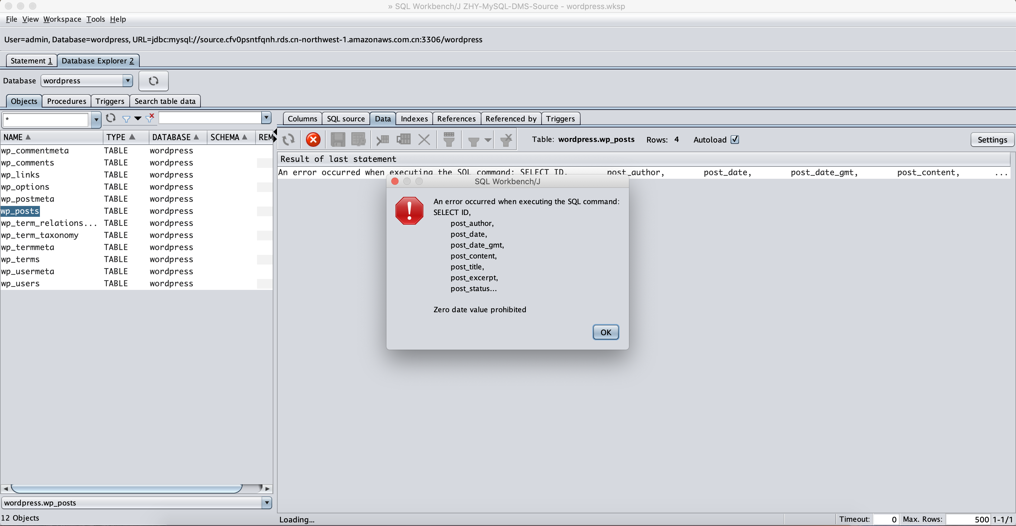 排查后发现是数据类型的问题,在这张表中,日期为空的时候,默认值是0000-00-00这样的数据类型,这个会导致JDBC报错。