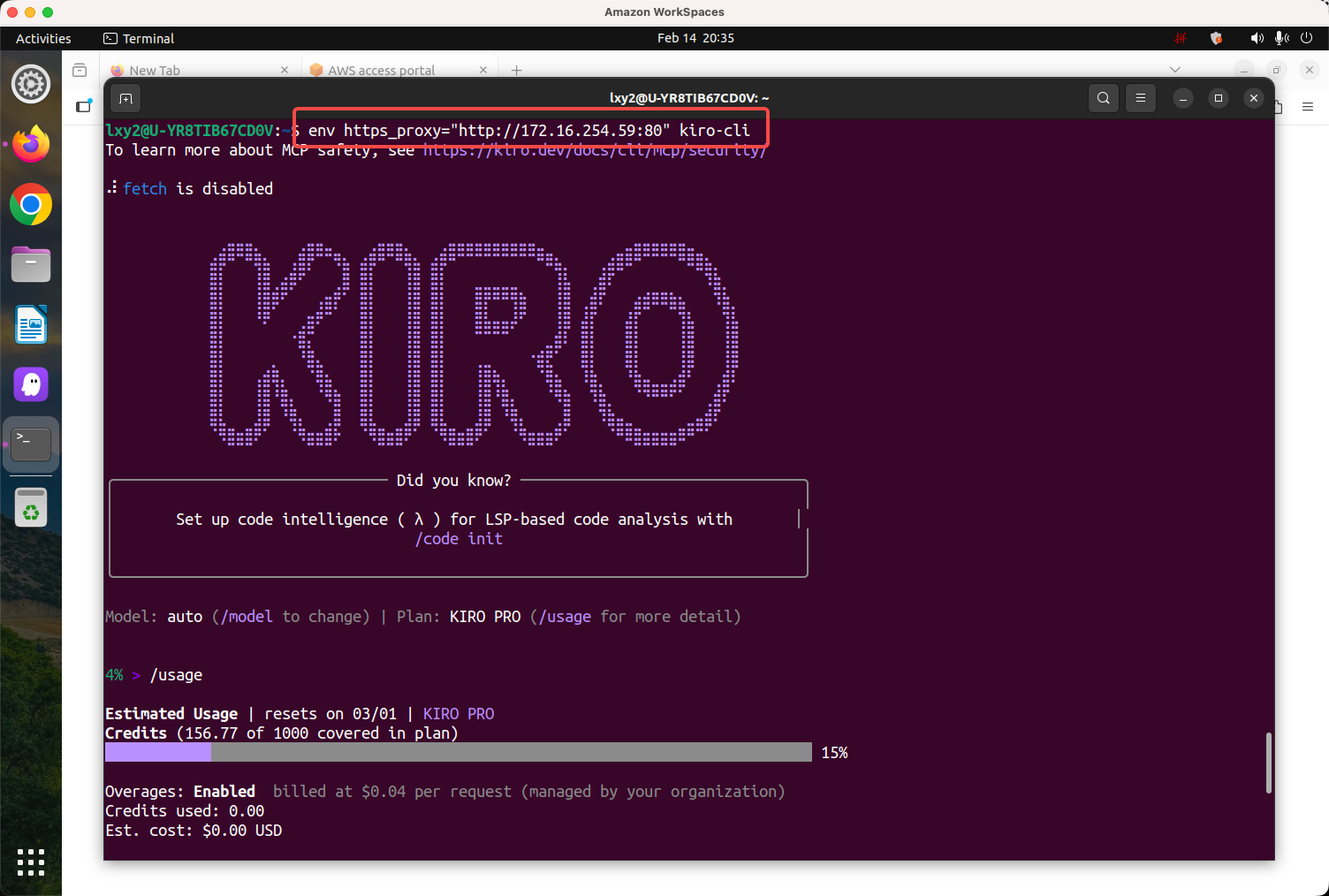 Kiro CLI/IDE需要外网访问权限才能完成登录和模型调用,因此在纯内网是无法使用的。当为一台纯内网的云桌面开发机部署Kiro的时候,需要通过网络白名单的形式,放行特定域名。本文以通过HTTP Proxy代理形式为例,介绍在Ubuntu 22.04 Linux云桌面上通过HTTP Proxy使用Kiro。