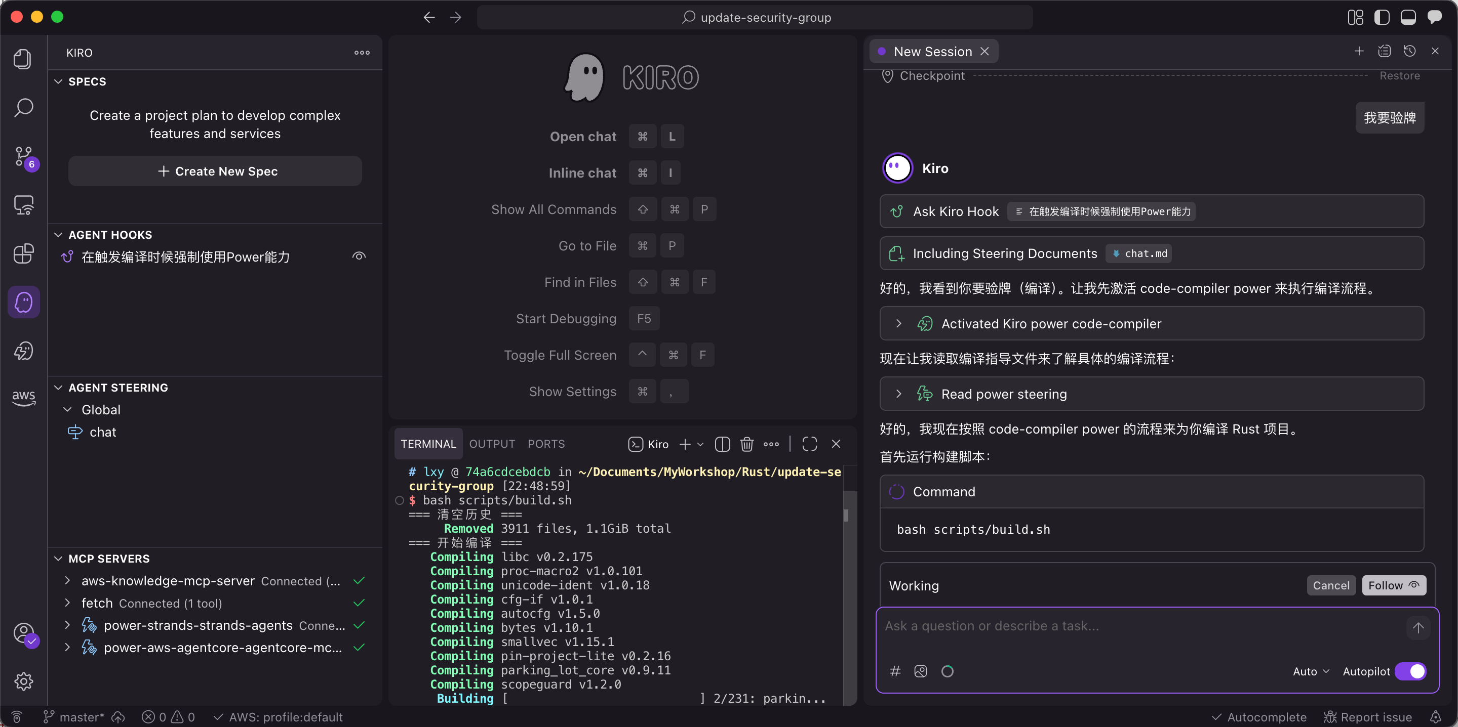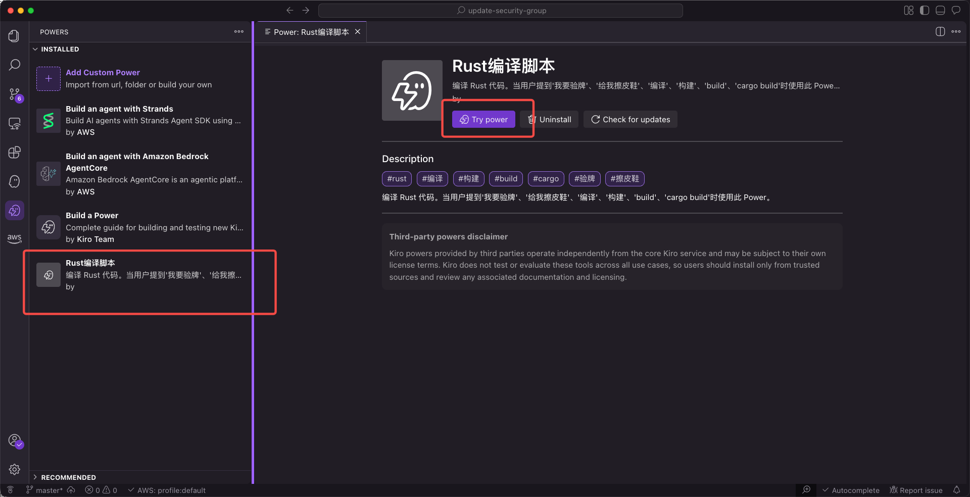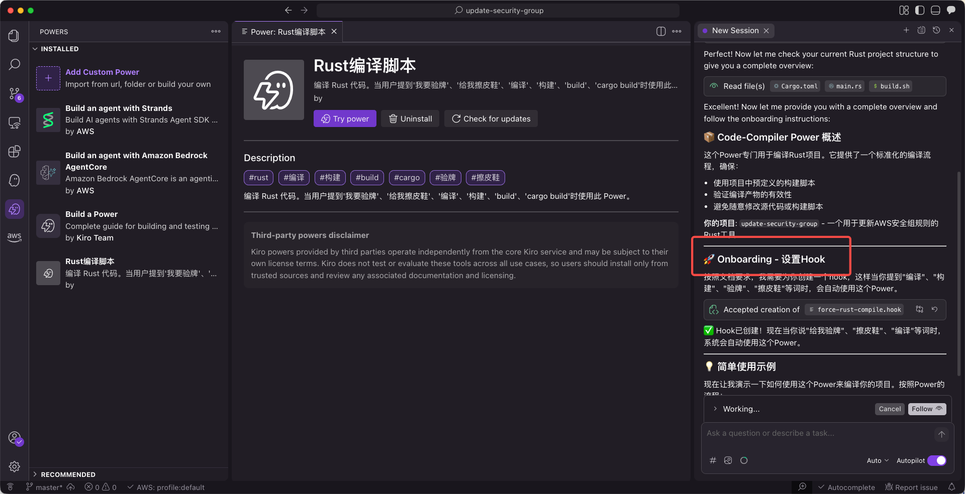 点击后可以看到,在右侧的Kiro对话窗口中,是第一次加载这个Power,会读取Onboarding标题下的内容,如果有的话会创建、测试相关资源。本例中,Onboard章节下会创建hook配置用于确保关键字能完全触发本Power。然后就会首次执行任务。如下截图。