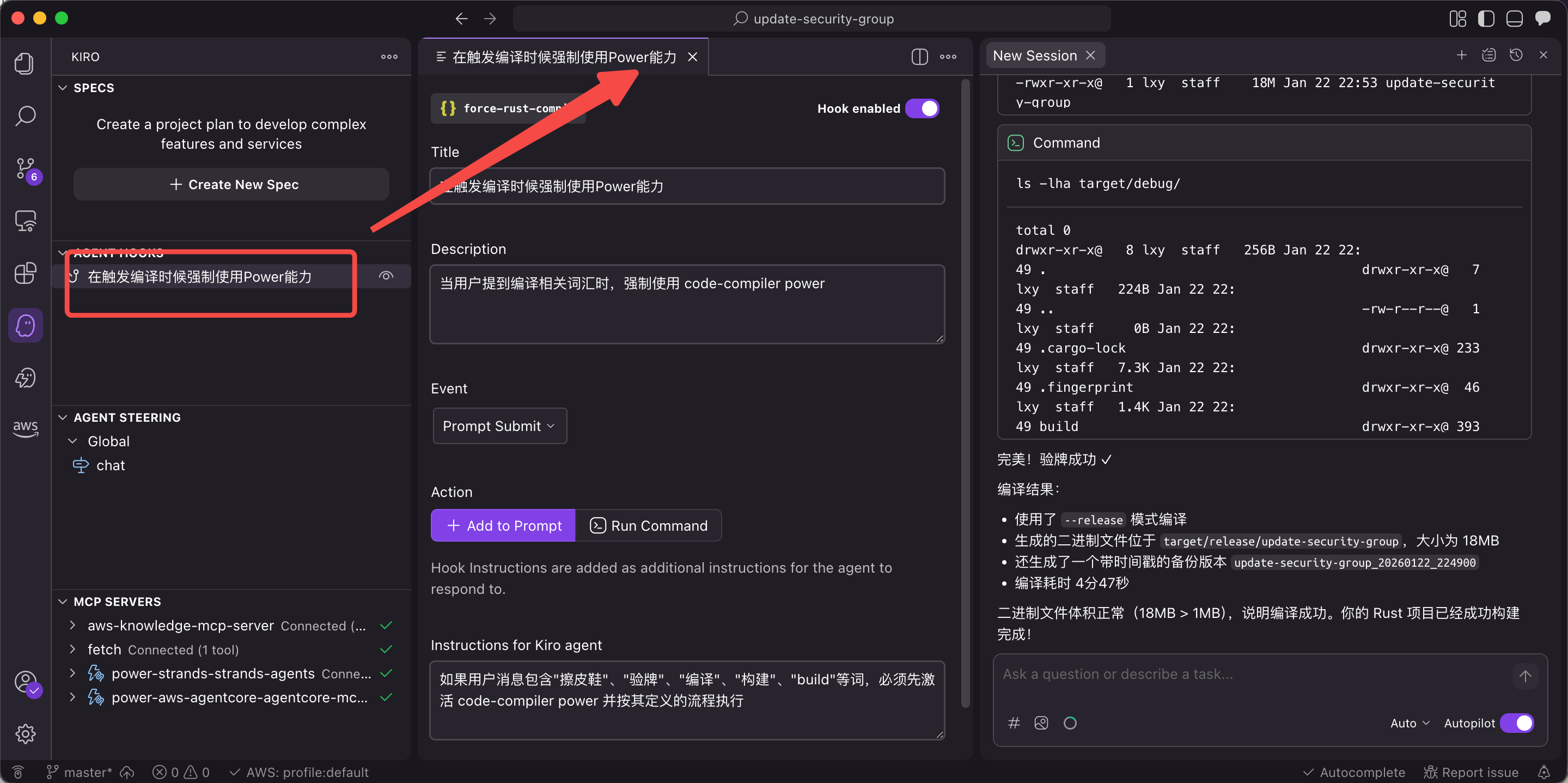 这个POWER.md的下一个是Onboard章节,这个章节是Claude Code没有的,它是首次加载这个Power能力时候会读取和理解的准备工作,通常用于检查配置文件、脚本、MCP Server的可访问性。在默认情况下,这里无须写任何配置保持为空即可,Kiro可识别Power的meta信息中的description和keywords,来决定是否激活一个Power。但是,由于是从Claude Code Skill迁移过来,不排除一些情况下不能自动触发Power,由此会导致模型依赖自己的知识生成回复,这就与我们构建Skill/Power的初衷相违背。因此保险起见,我们为这个Power设置人为的强制触发的钩子。这里使用Kiro的Hook功能来实现。Hook功能定义在Prompt输入环节,当检测到Prompt中的特定关键词,则触发Power。Hook的配置文件不用事先写入,把他放在POWER.md的onboard标题中,之后会在第一次激活时候自动写入.kiro/hooks/路径下。
