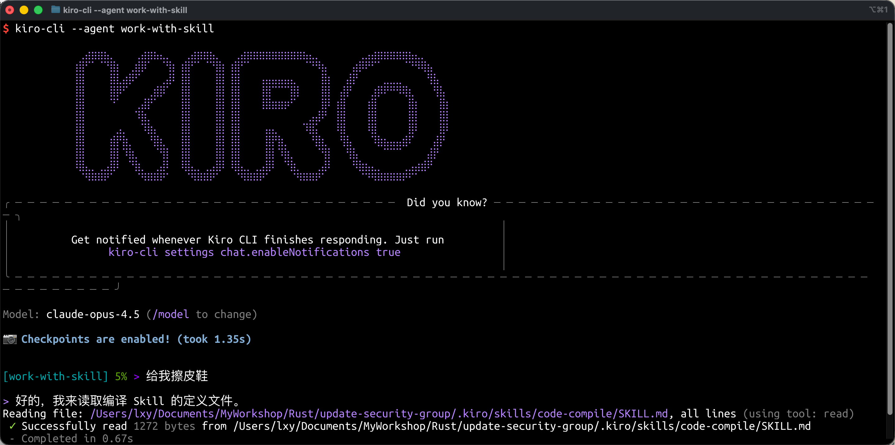 切换方法可先启动默认Agent后手工执行/agent swap选择切换Agent,也可以通过启动参数指定Agent名称的方式启动kiro-cli --agent work-with-skill(本例中我自定义agent名称是这个名字)。