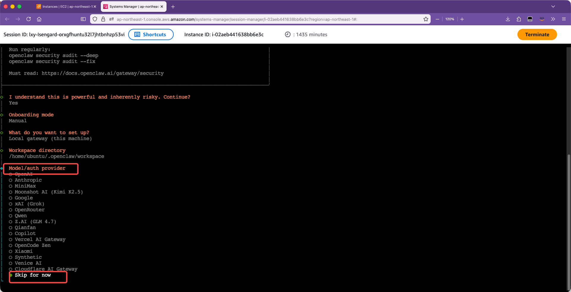 /home/ubuntu/.openclaw/workspace直接按回车即可。 - Model/auth provider? 这里选最后一项