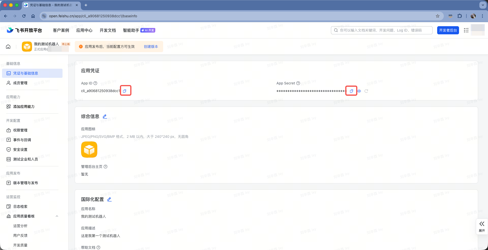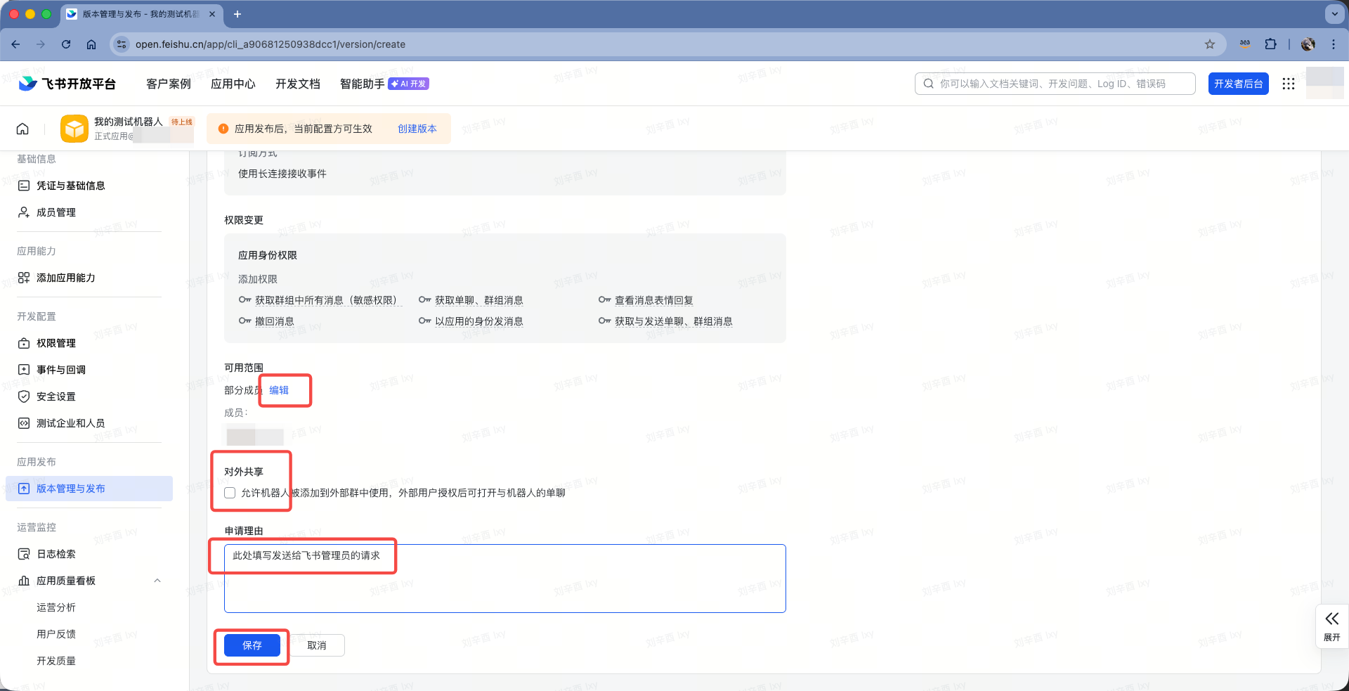 注意:飞书机器人要想被外部应用调用,必须进行版本发布操作。如果您是飞书企业用户,这一步需要您的企业管理员审批。如果您是飞书个人用户,那您创建的飞书机器人只可以和自己说话,无法添加到与别人的对话中。与其他人互动的飞书机器人要求必须是企业账号、且完成企业营业执照审核才可以。