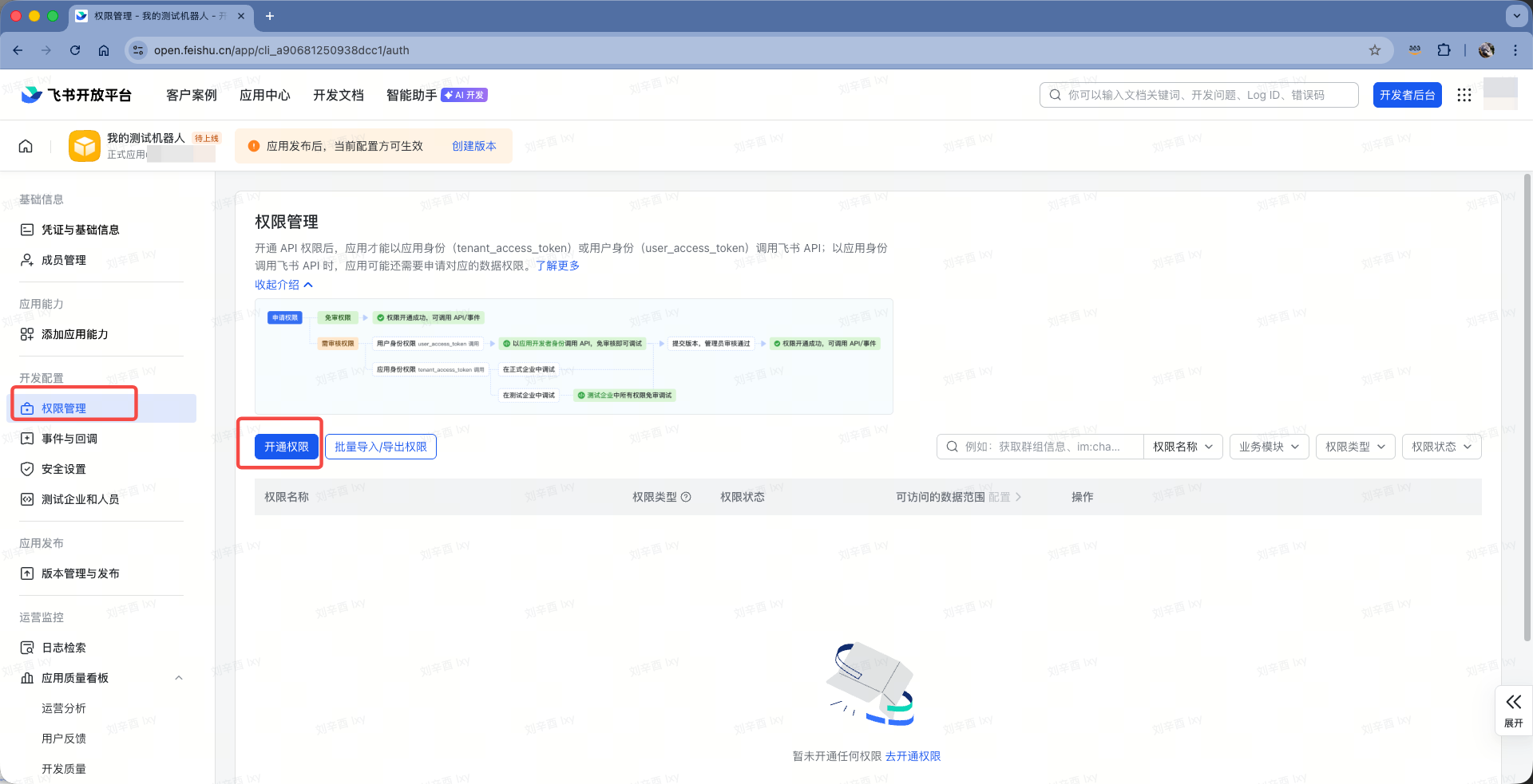 继续配置机器人。在左侧菜单开发配置下,点击权限管理。点击右侧的开通权限按钮。如下截图。