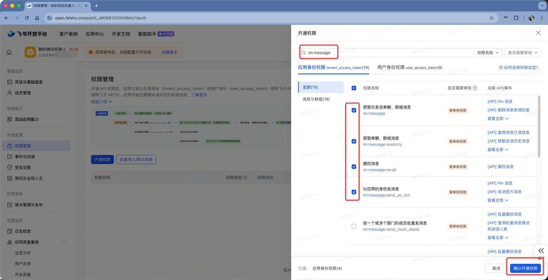 在开通权限对话框内,搜索关键字,找到如下权限后,点击确认开通权限按钮。如下截图。