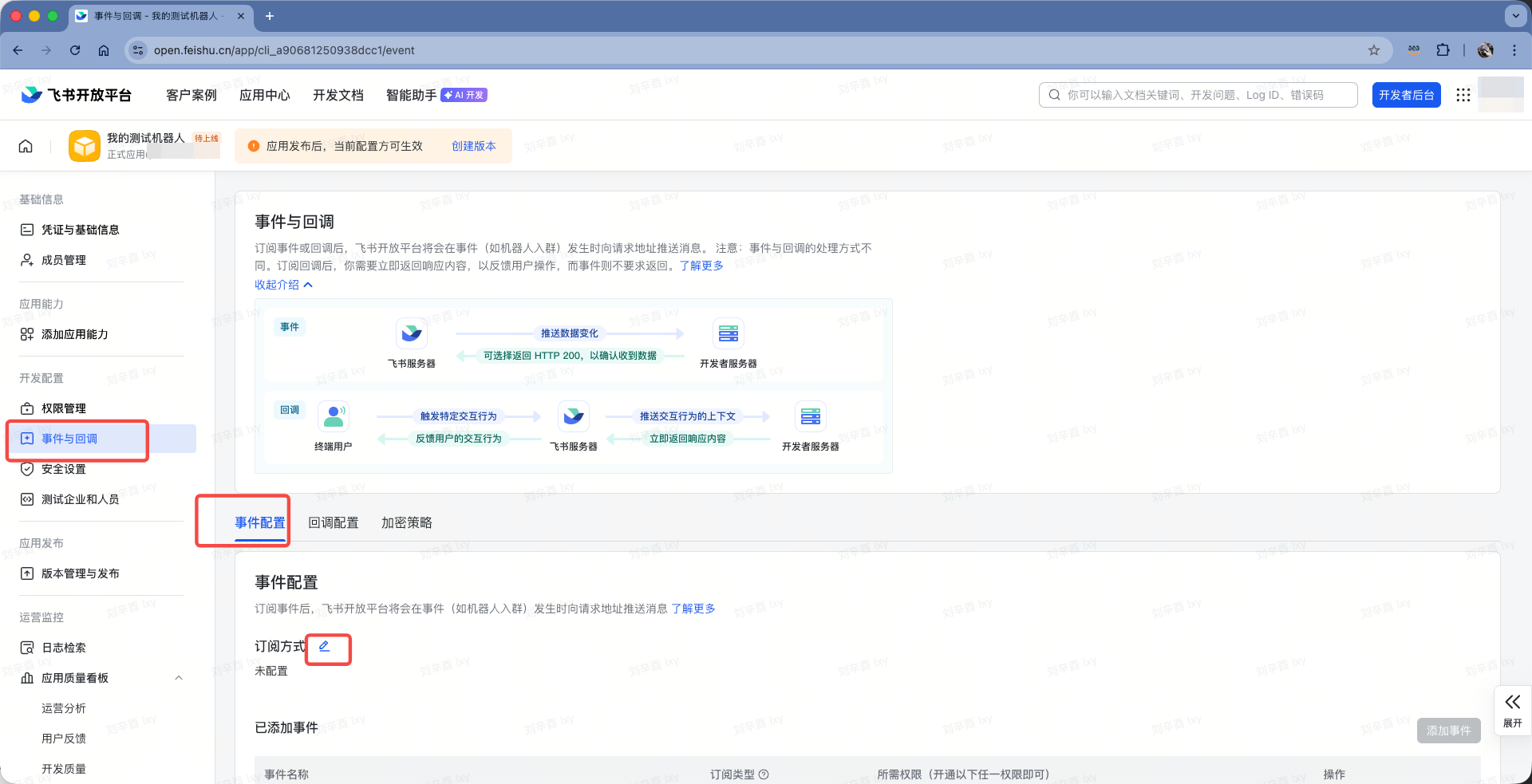 接上一步,确认python程序打开状态,也就是长连接一直活跃。然后在飞书开放平台左侧,点击事件与回调菜单,在右侧点击标签页事件配置,点击下方的订阅方式。如下截图。
