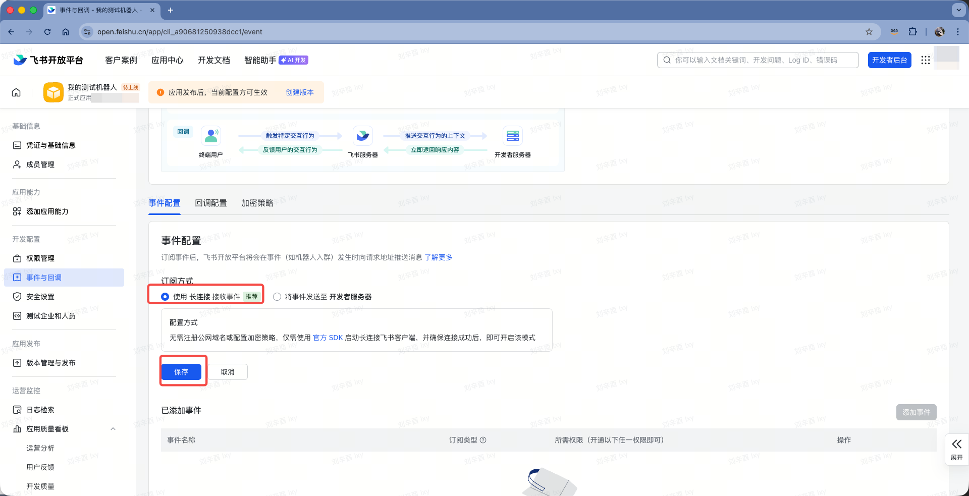 在订阅方式位置,选择使用长连接接受事件(推荐),然后点击保存。如下截图。