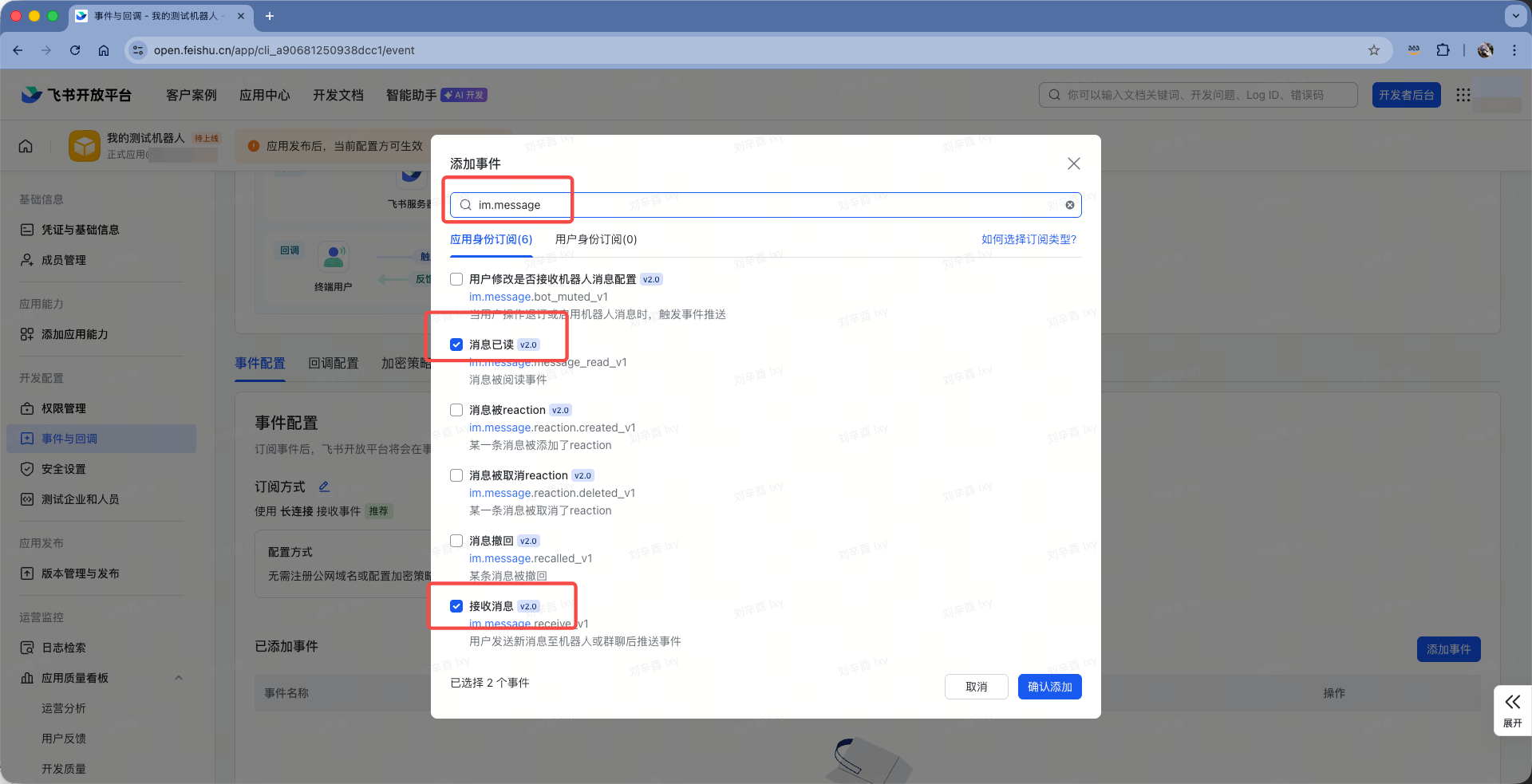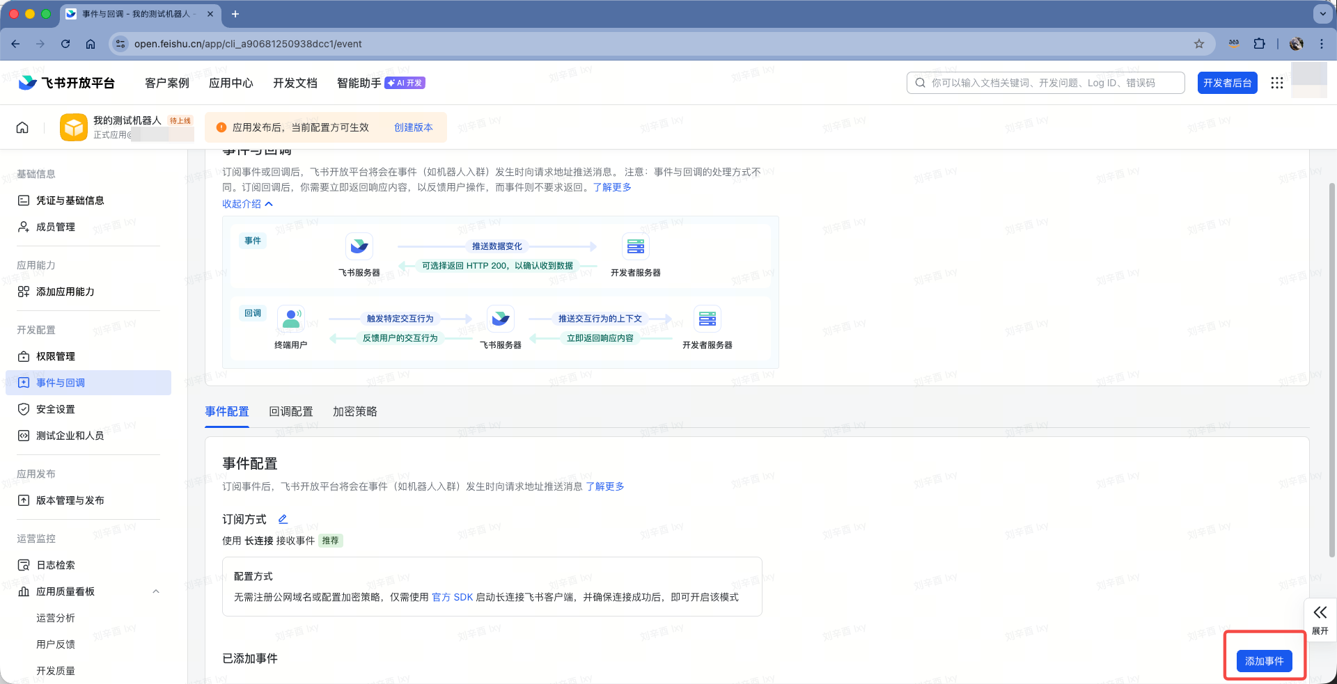 继续在刚才事件与回调界面,配置完毕长连接后,点击右下角的添加事件。如下截图。