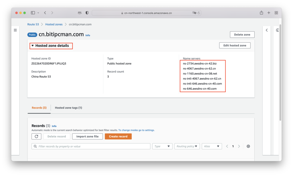 接下来在中国区Route53创建一个Zone文件,并获得6个NS记录。如下截图。