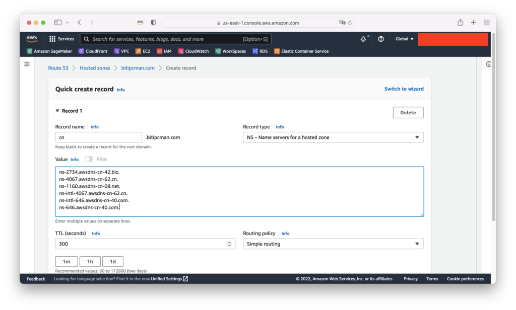 进入海外区域Route53,找到顶级域名abc.com对应的zone,然后在其中增加新的解析记录,输入子域名是cn,类型是NS,然后粘贴中国区生成出来的6个NS地址。如下截图。