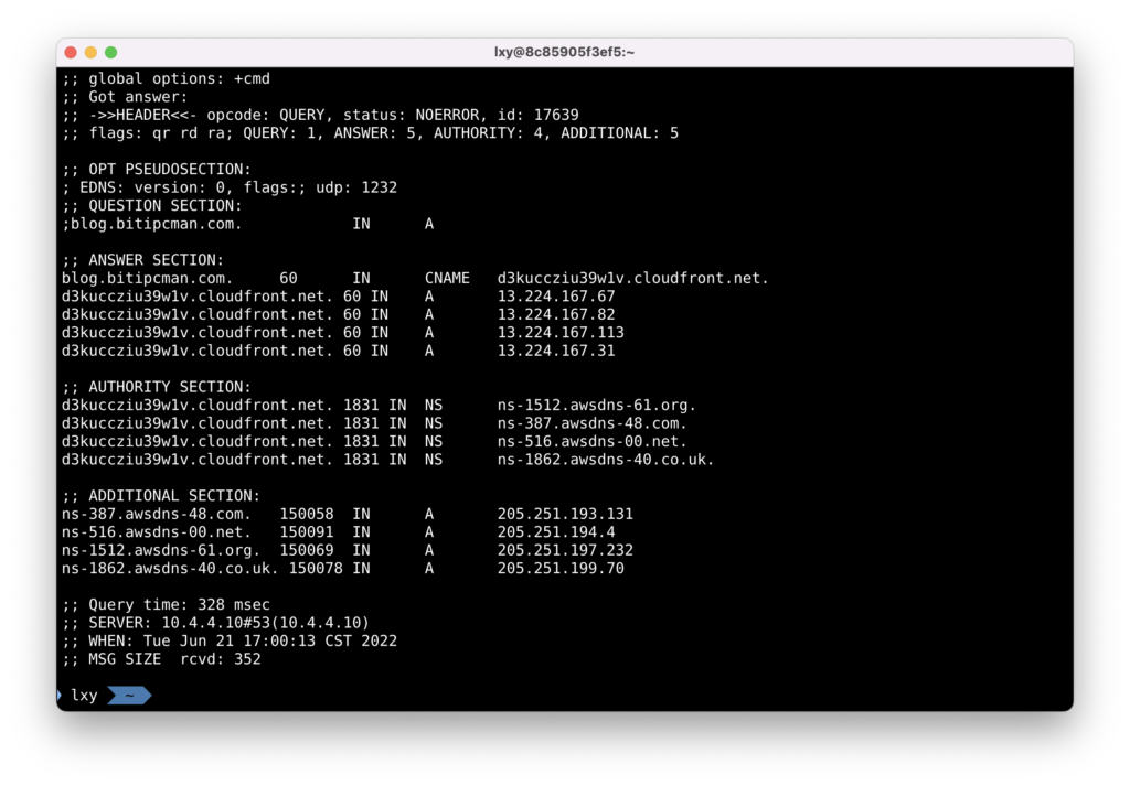 解析的是海外Route53的4个DNS服务器。由此表示顶级域名下的子域名解析在海外Route53上完成。
