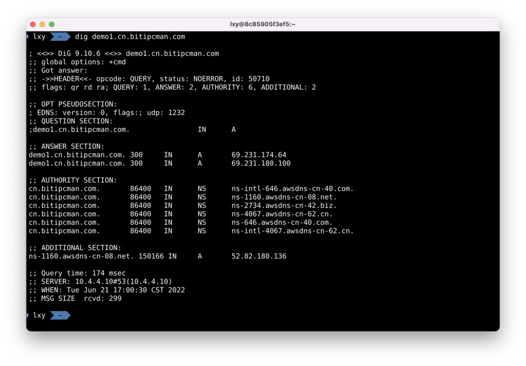 解析的是中国区Route53的6个DNS服务器。由此表示顶级域名下的子域名解析在中国区Route53上完成。