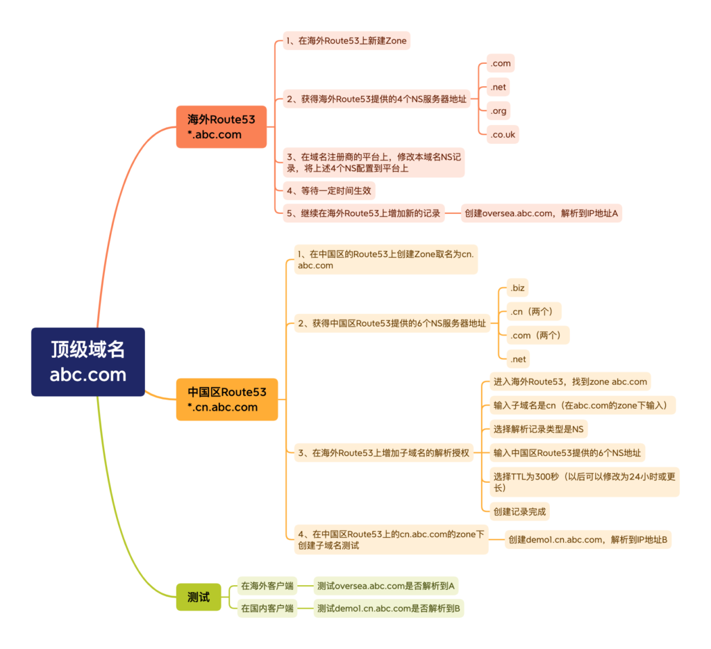假设顶级域名是abc.com,那么可以将顶级域名的解析部署在AWS海外Route53服务商。然后,创建子域cn.abc.com,将子域的解析配置在AWS中国区Route53服务上进行解析。