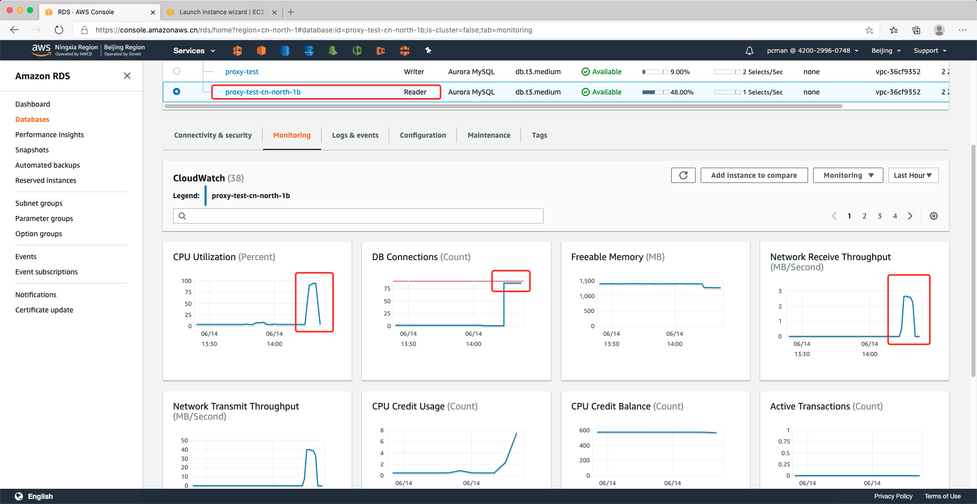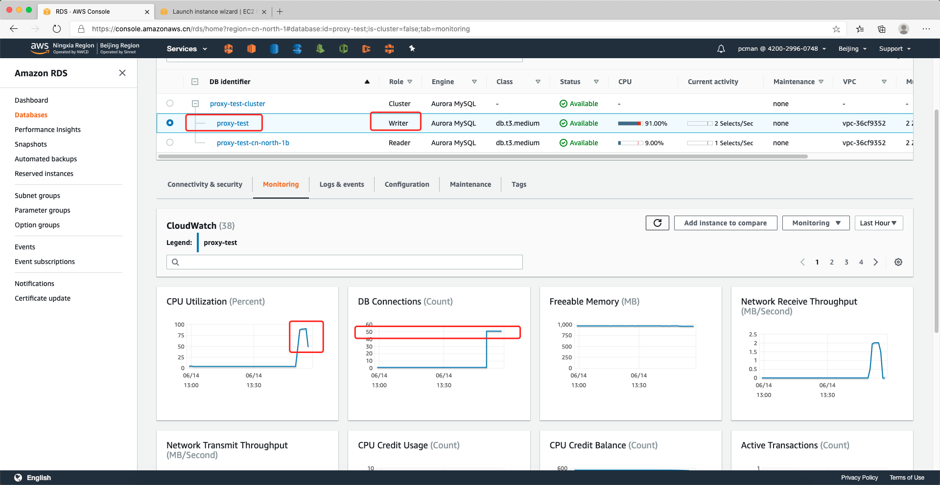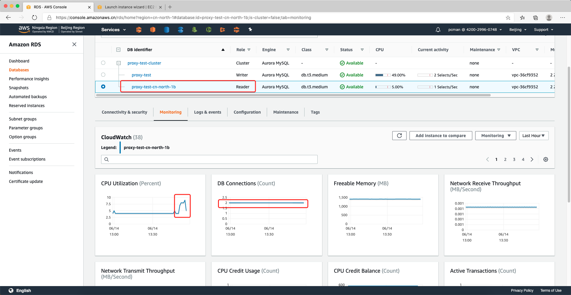在测试过程中,通过AWS控制台,查看RDS的Aurora主实例和只读实例的监控数据,发现两个实例都发生了数据库连接,连接数均达到了50个连接被建立。如下截图。