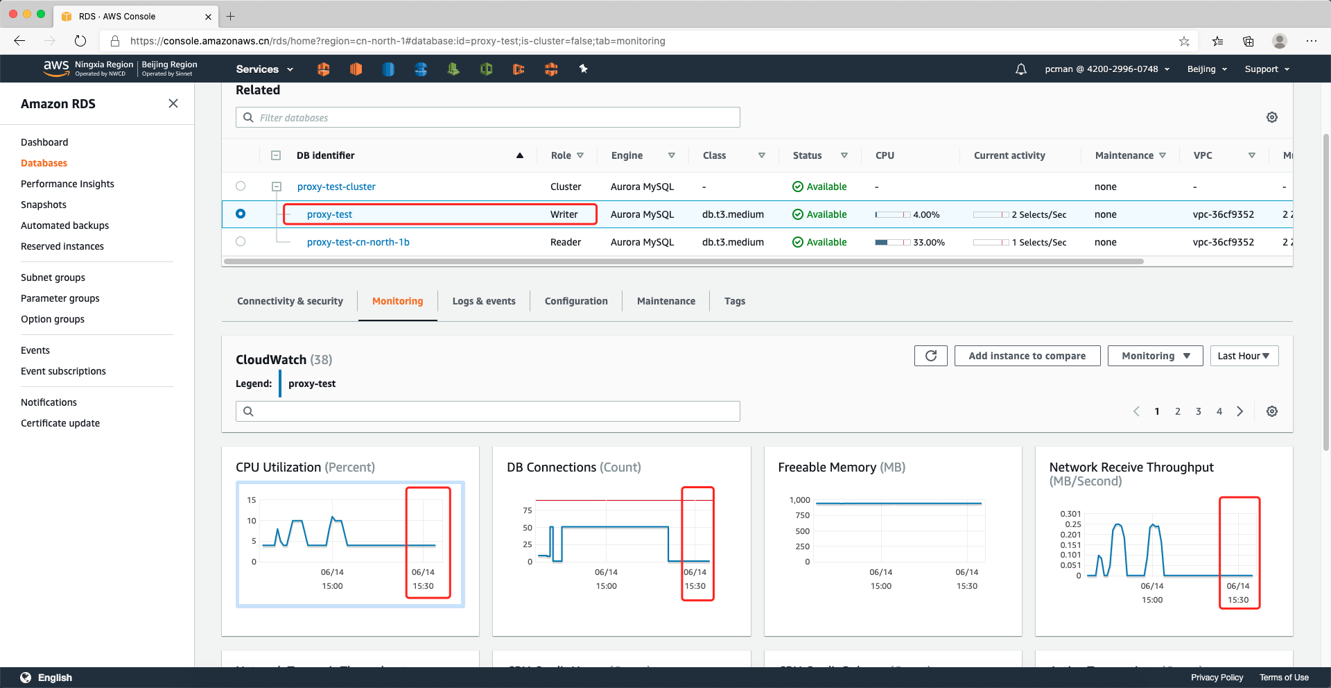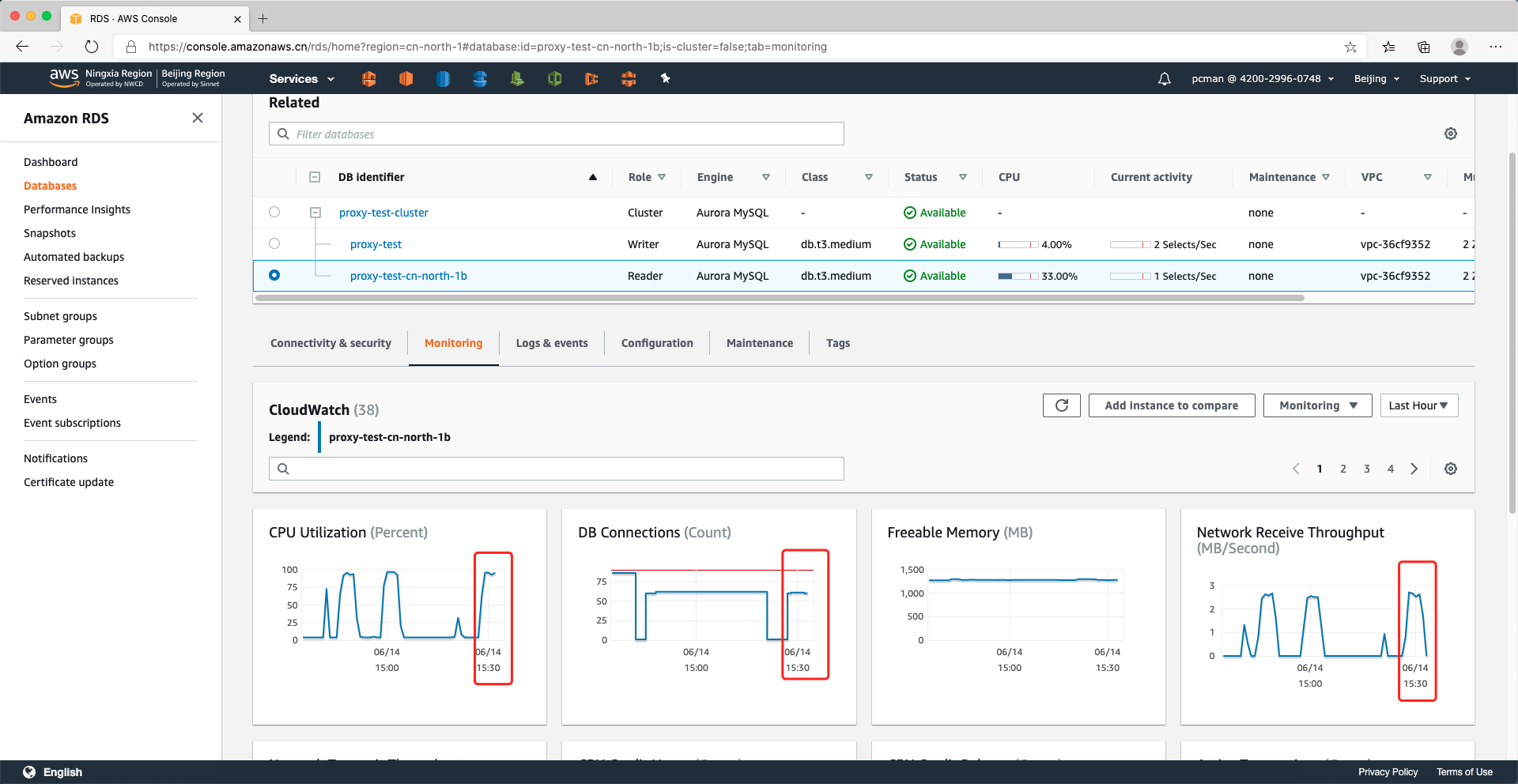 这里需要注意的是,执行插入测试数据时候,会写入大量的数据,此时数据是写入到主节点的,并通过Aurora的复制技术传输到只读节点。由此,主节点和辅助节点都有一定的CPU占用,这是正常的。数据导入完成后,等待一段时间,让CPU和负载逐渐平缓,并记录测试开始时间,稍后将从RDS控制面板上查询数据库性能。