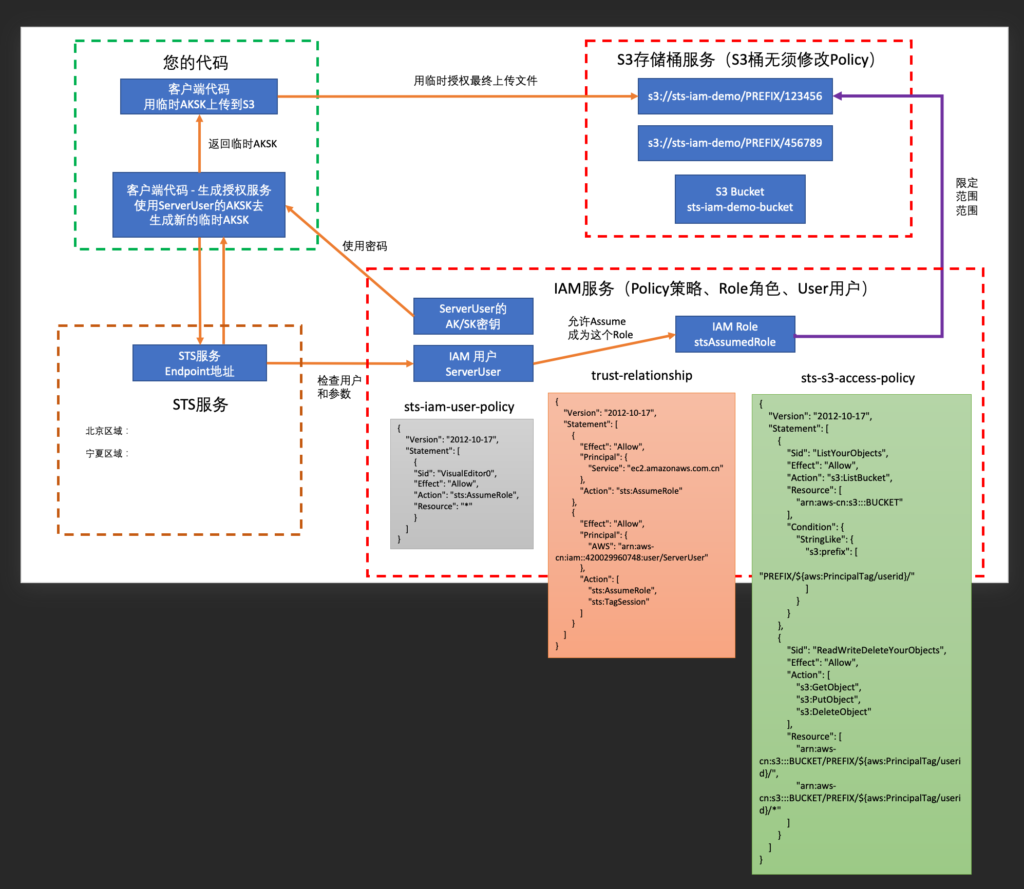 - A希望对S3临时读写,想获得一个临时有效的AKSK做上传。