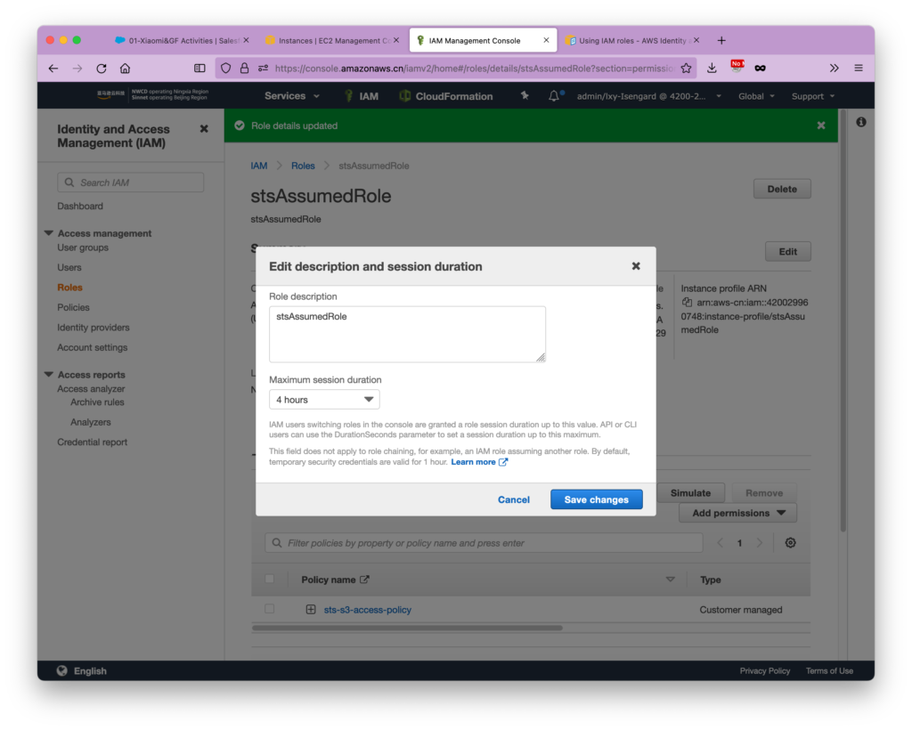 使用STS服务Assume为一个Role角色时候提示超过最大session时间的限制