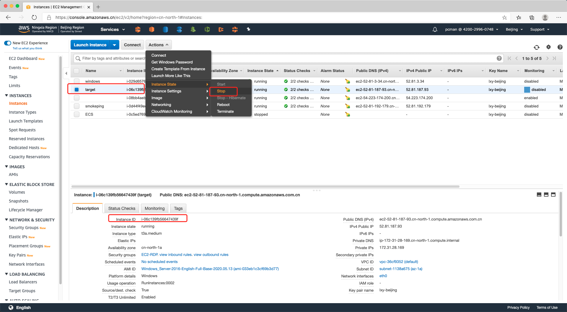 首先将无法启动的EC2停止。并且复制下这个EC2的实例ID。如下截图。