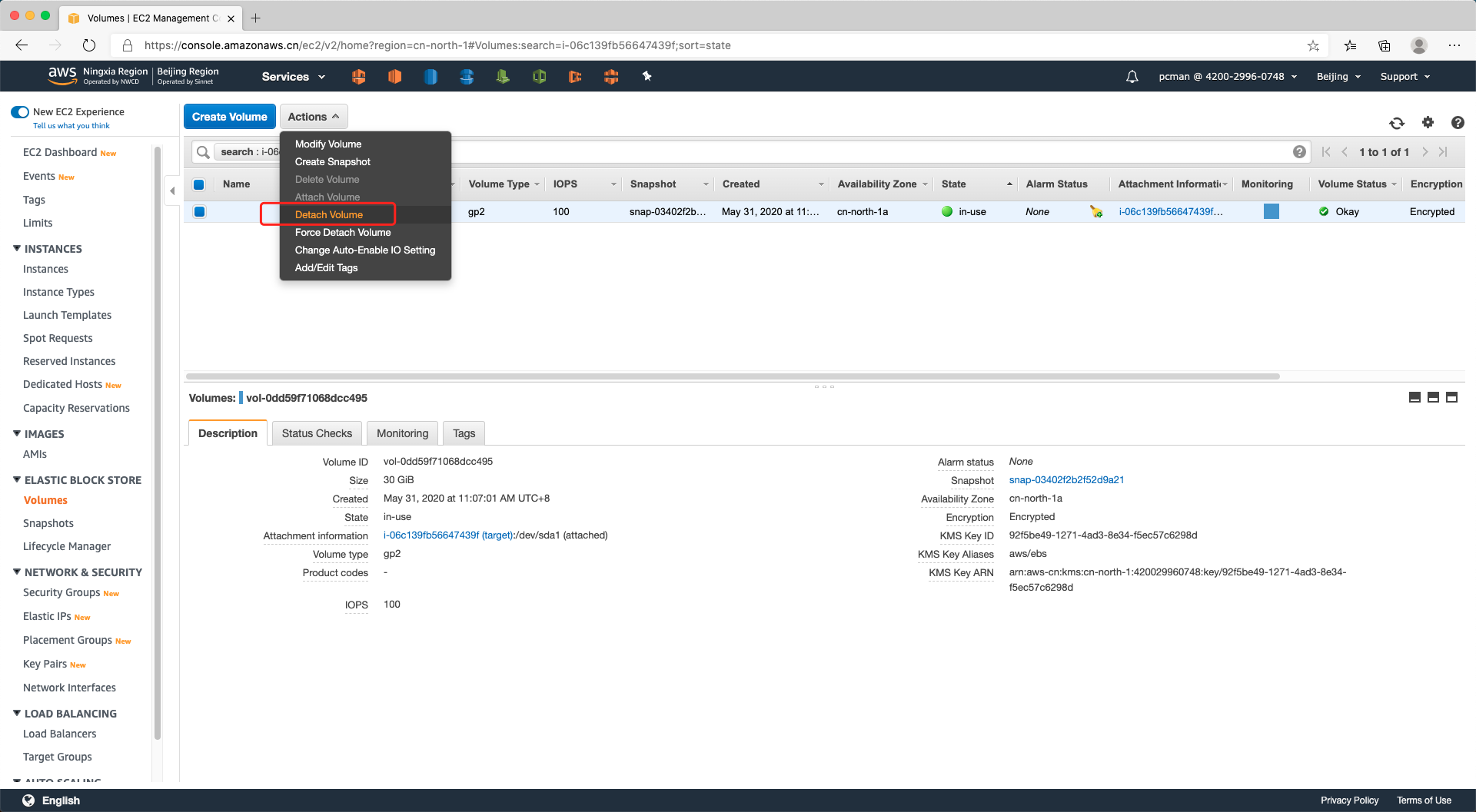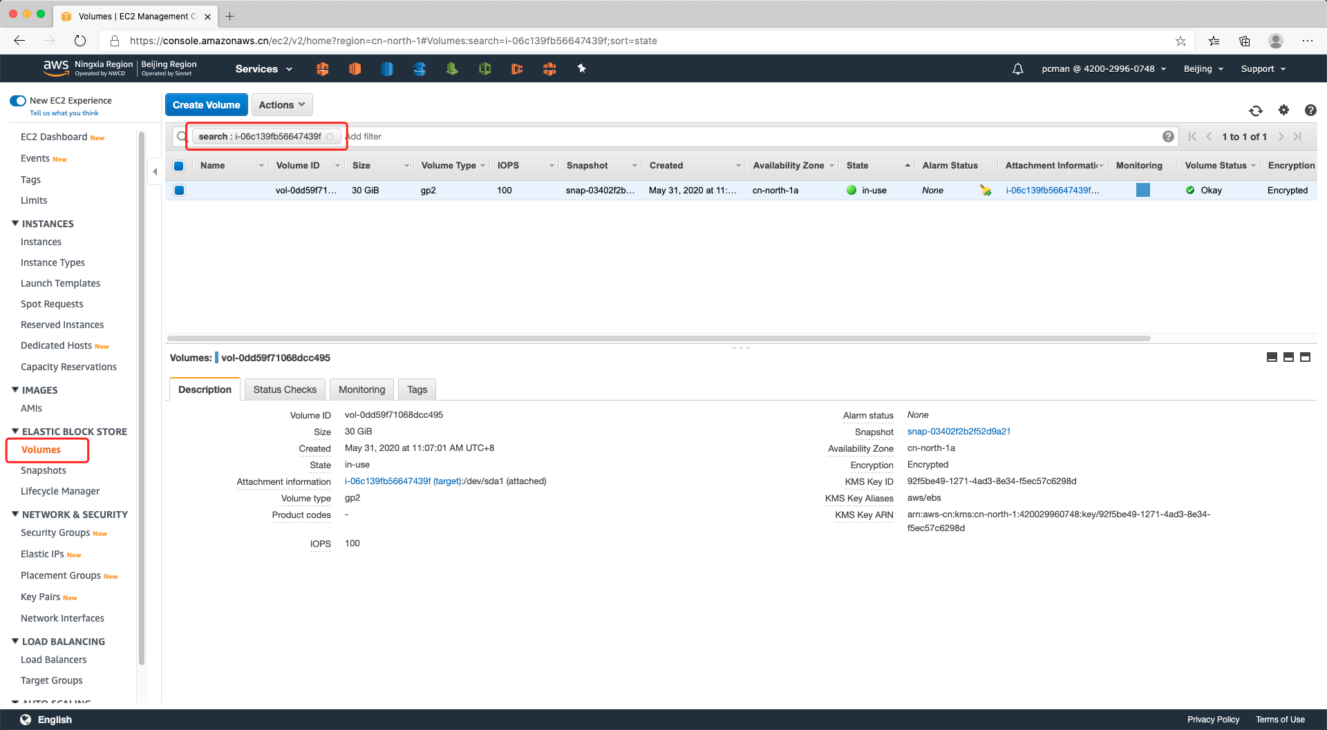 进入到EC2的EBS卷管理界面,在磁盘清单中,输入刚才的实例ID,并按回车键搜索,此时界面将过滤出来这个EC2的磁盘。如果有多个磁盘,则只需要系统盘即可。如下截图。