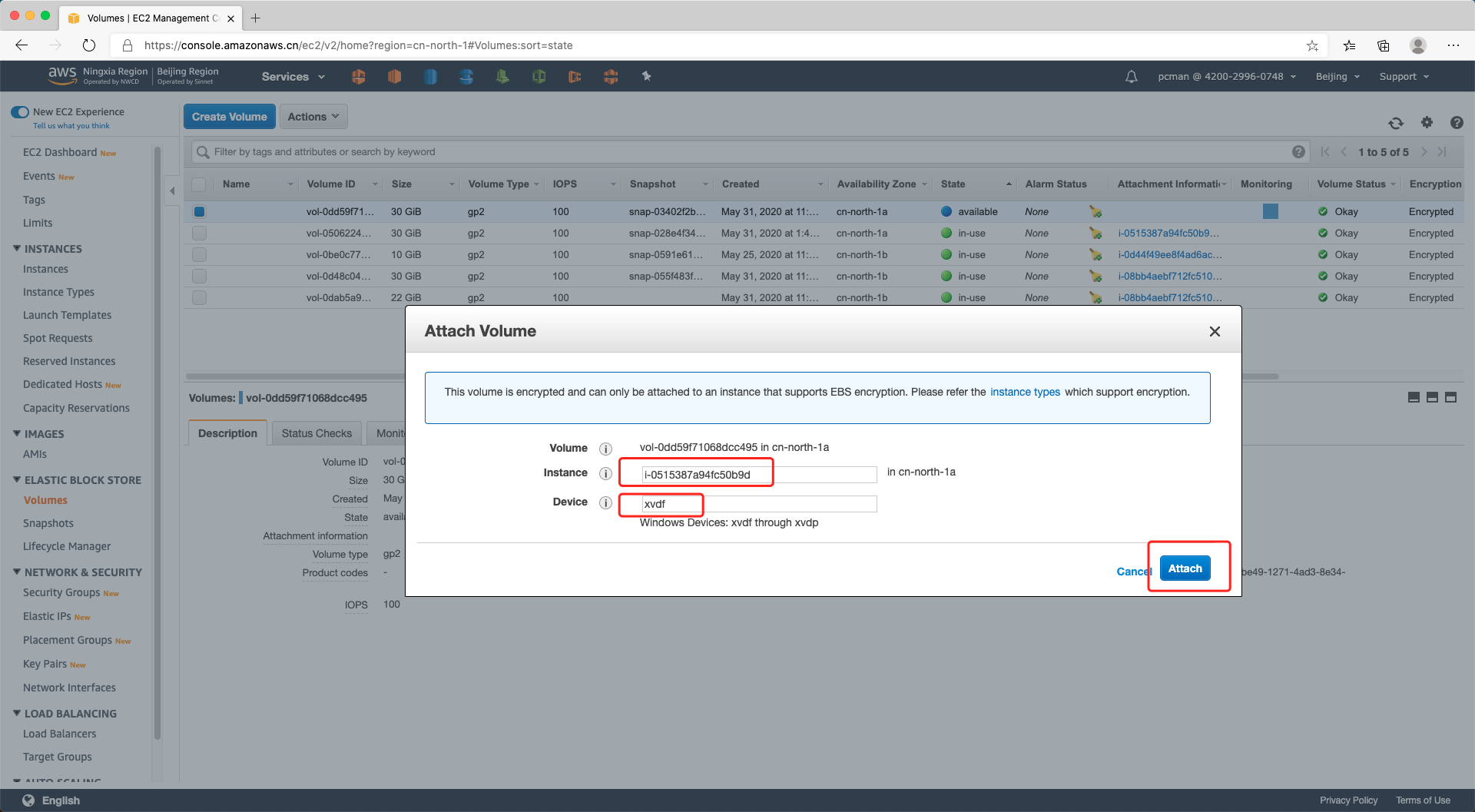 在要挂载的EC2的下拉框内,选择已经有EC2Rescue工具的虚拟机。其中Device名称这里,我们使用系统默认的xvdf即可。然后点击挂载。如下截图。