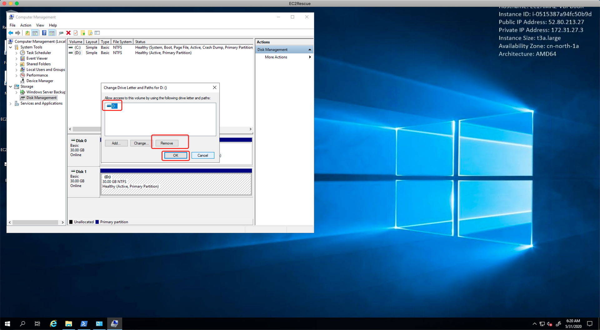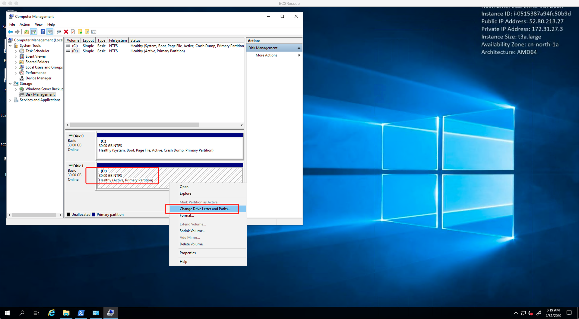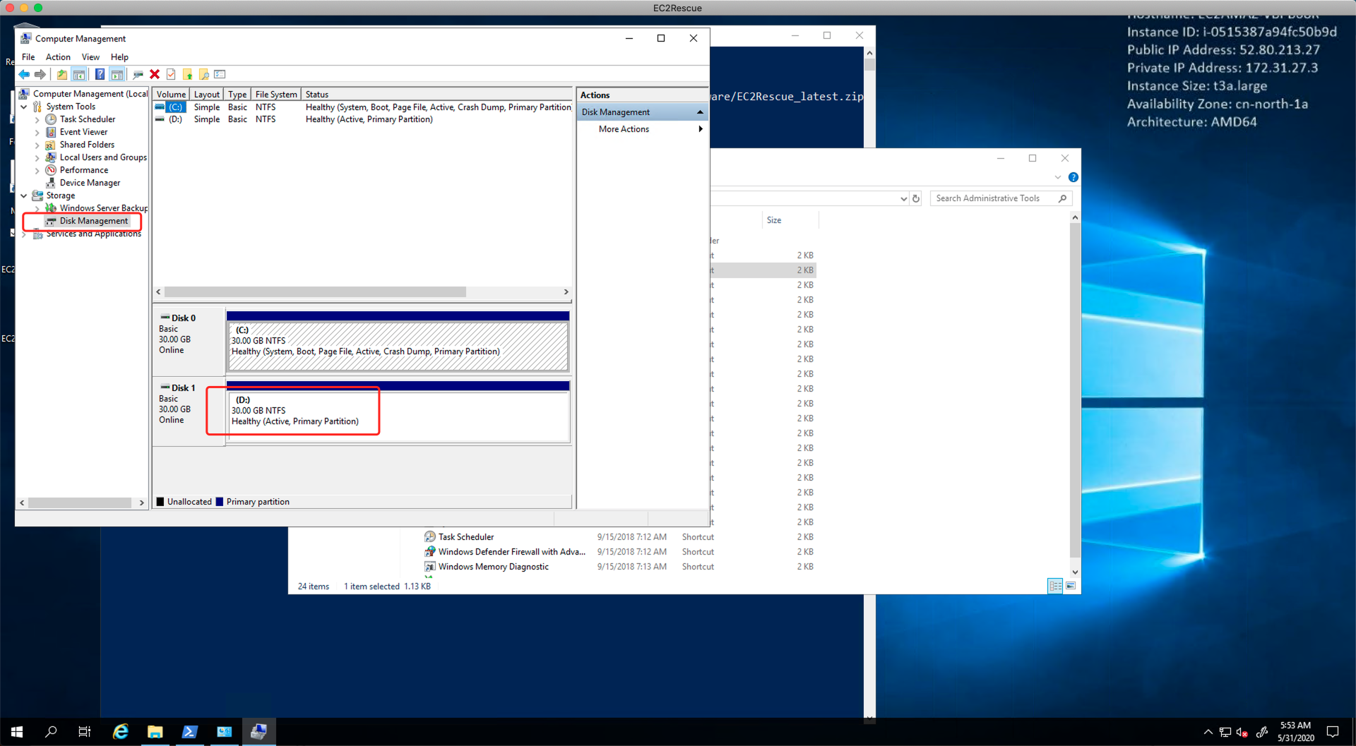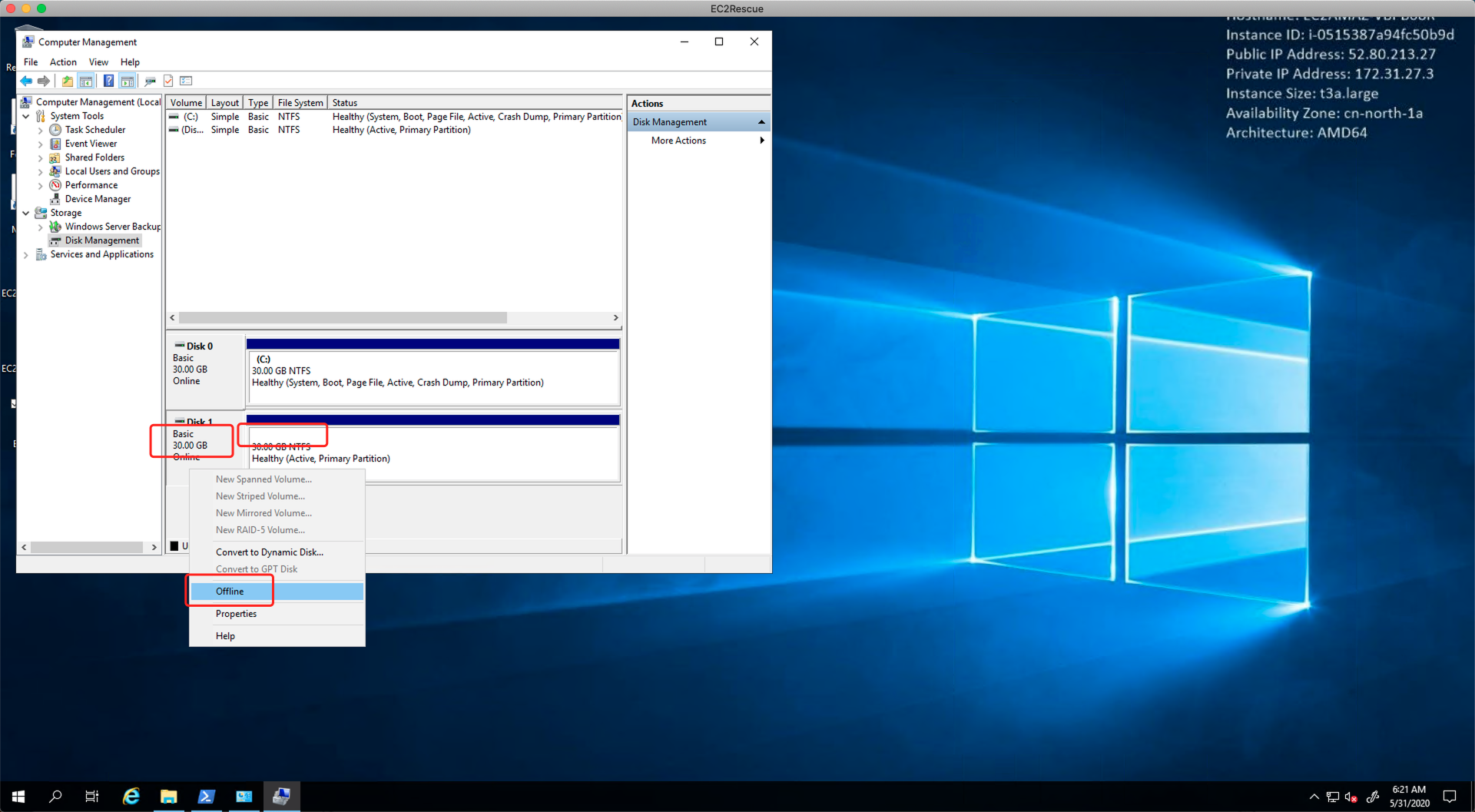 如前文所属,执行EC2Rescue故障分析的Windows必须与故障EC2位于同一个AZ。因为EBS磁盘不可以跨AZ。