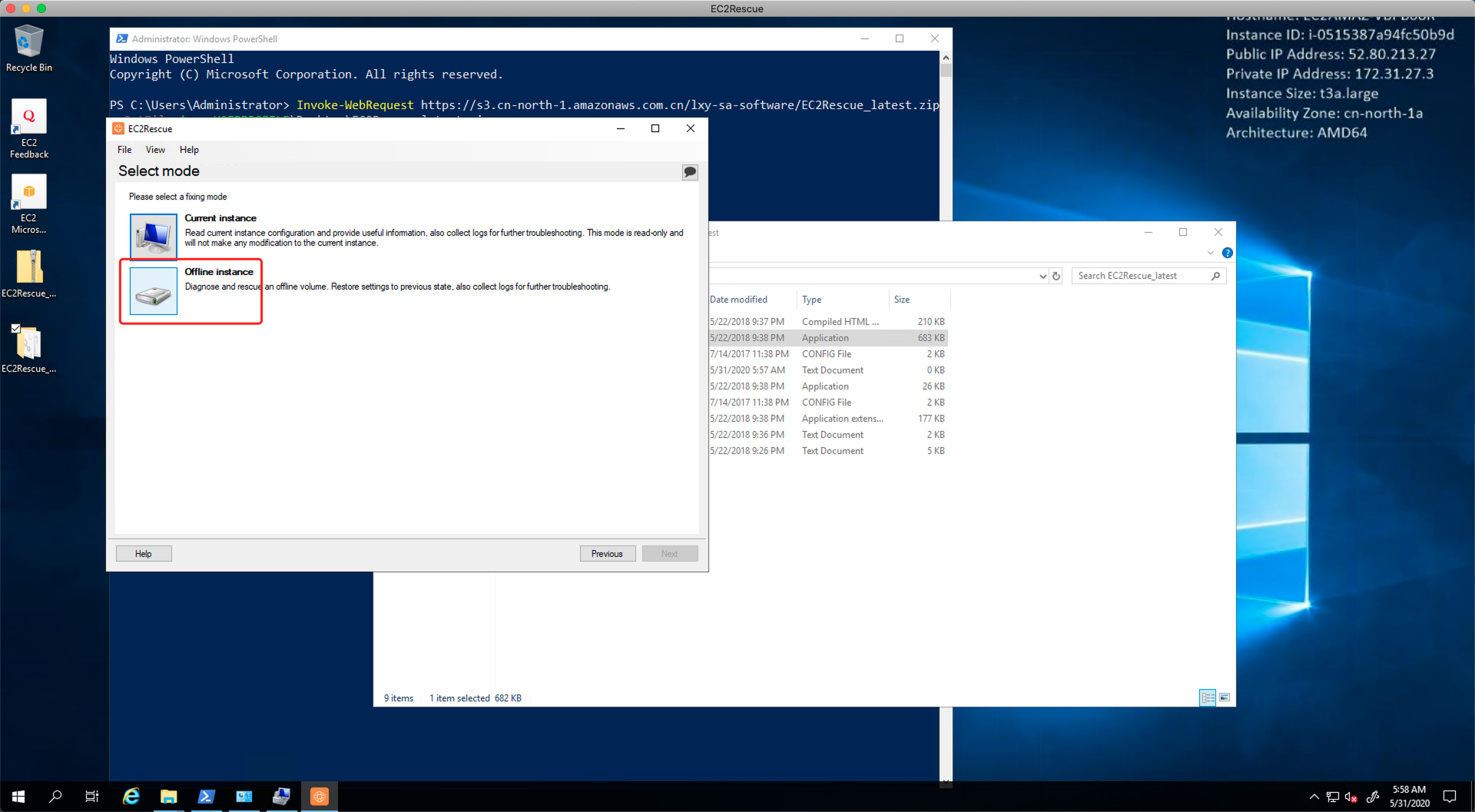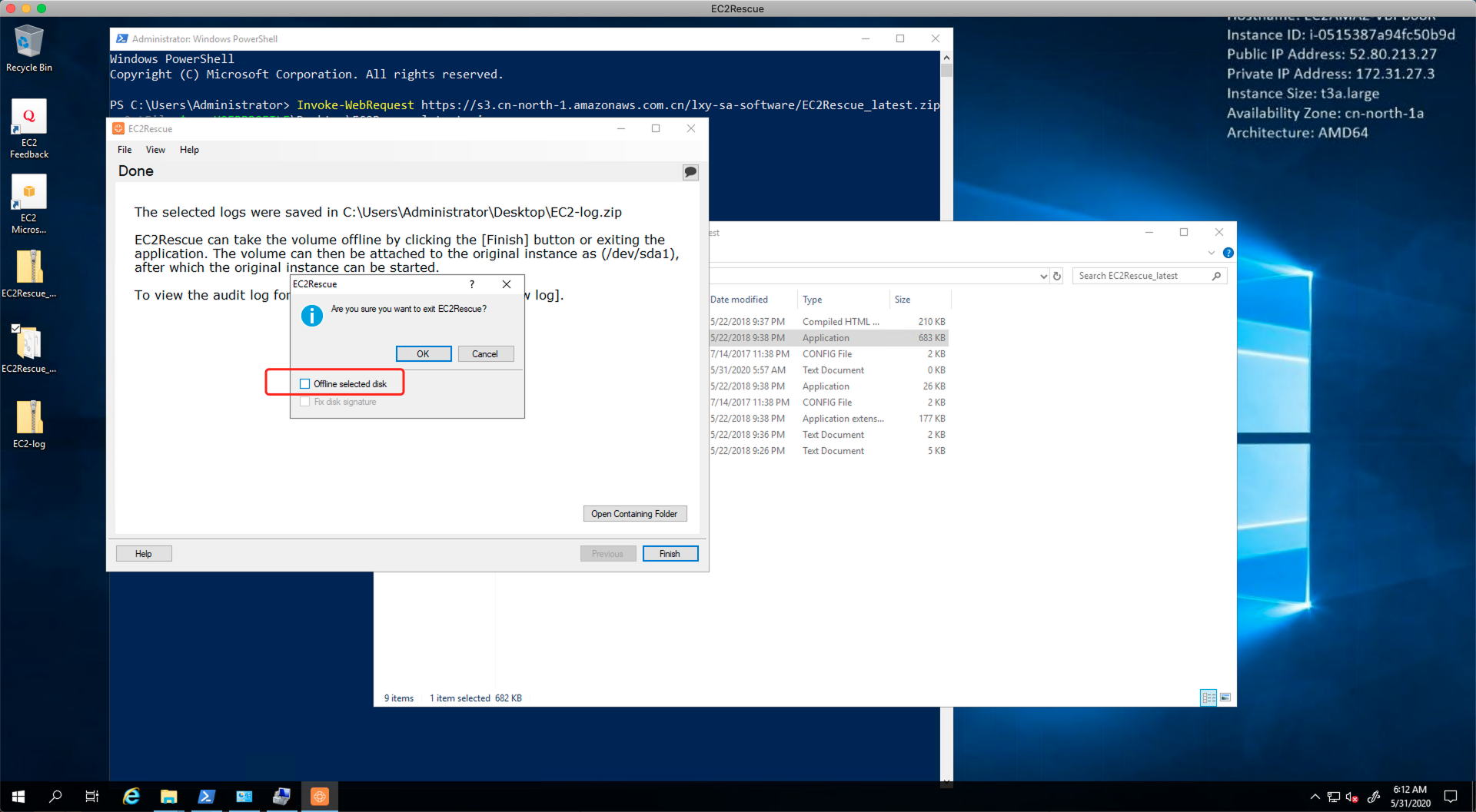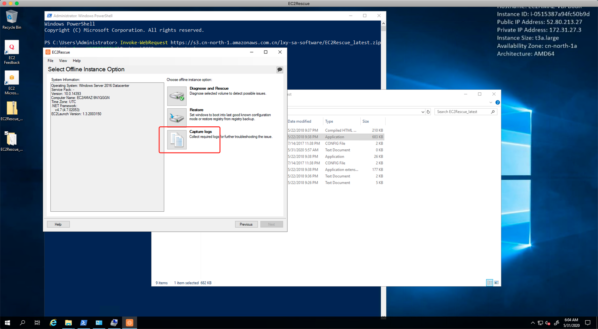如果问题更加复杂化,例如Windows系统崩溃,发生 BDOS(Blue Screen of Death,俗称蓝屏),或者其他故障,完全无法启动,那么可以使用EC2Rescue工具提取日志,以供后续故障分析。