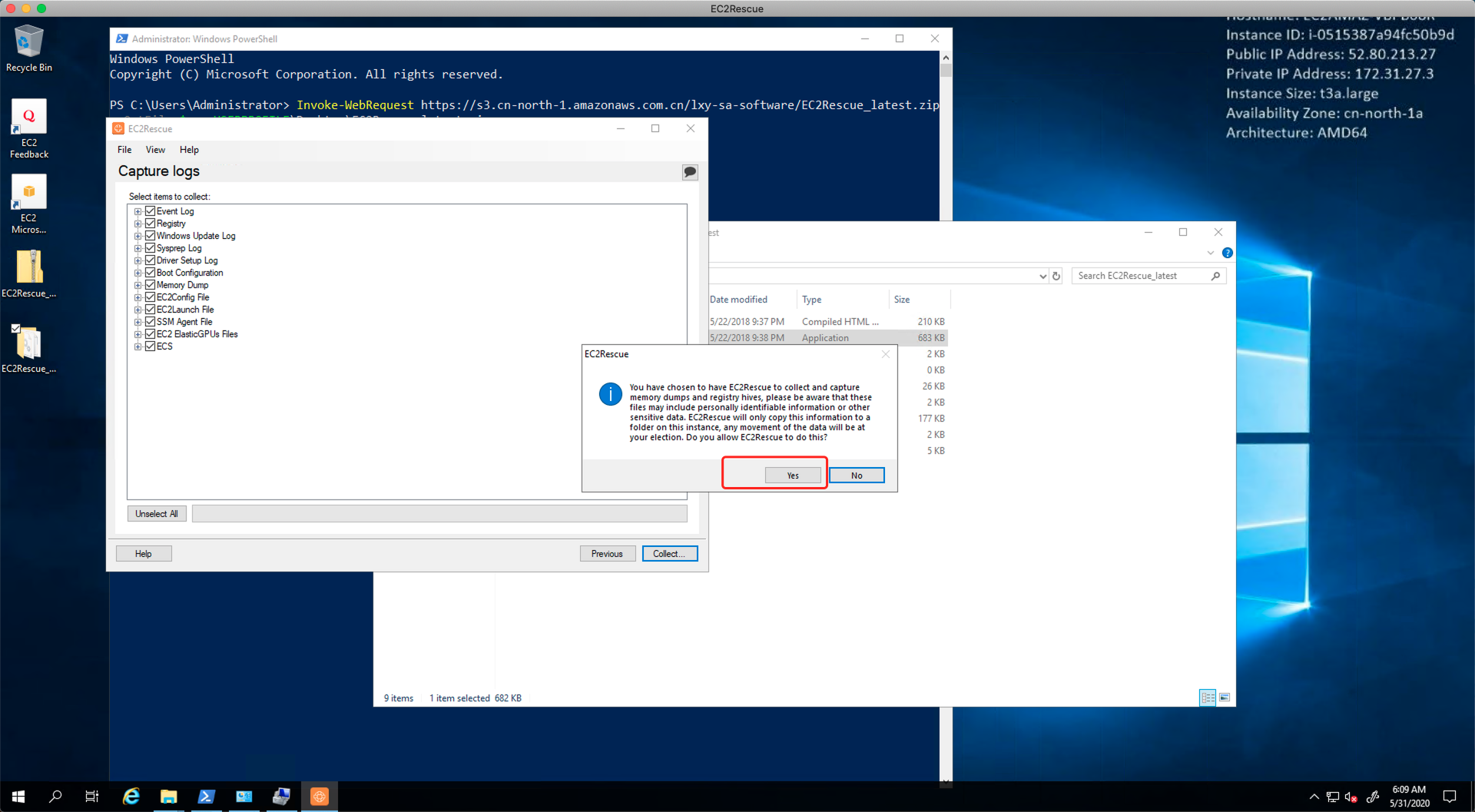 如果是遇到了蓝屏(BSOD)等问题,那么需要采集完整日志,包括内核崩溃后的kernel dump文件(内核转储),并使用debug工具跟踪分析。这时候就需要选择EC2Rescue的第三个按钮,采集日志。如下截图。