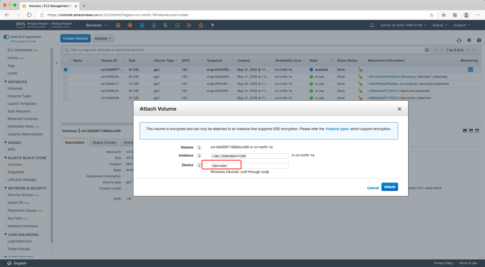 当调查完毕时候,需要将EBS挂载回原来的EC2。这里需要注意调整挂载点。当用于排错时候,EBS磁盘是作为D盘挂载到EC2,这时候挂载点是/dev/xvdf。当恢复原状时候,EBS磁盘需要挂载会原来EC2的系统盘,此时挂载点需要人为设置为 /dev/sda1 。如果还填写为/dev/xvdf,则这个虚拟机没有系统盘会无法启动。如下截图。