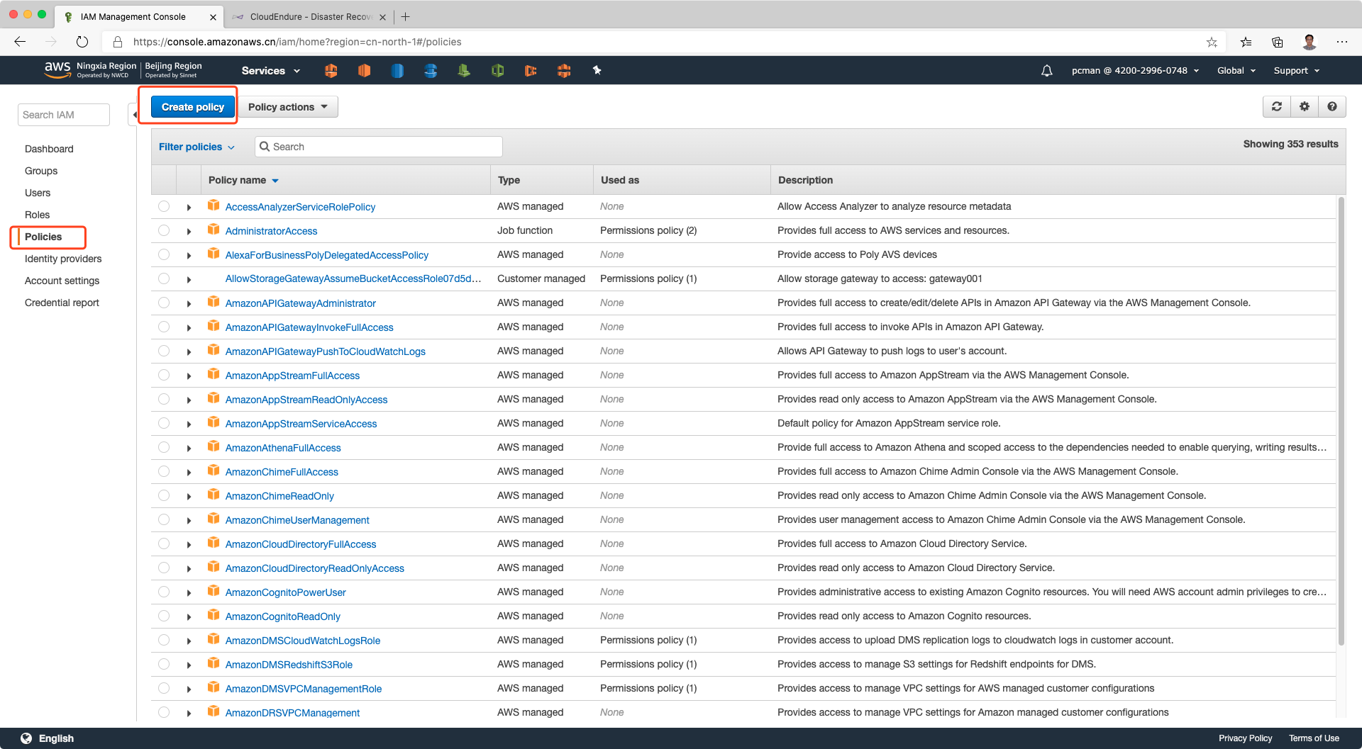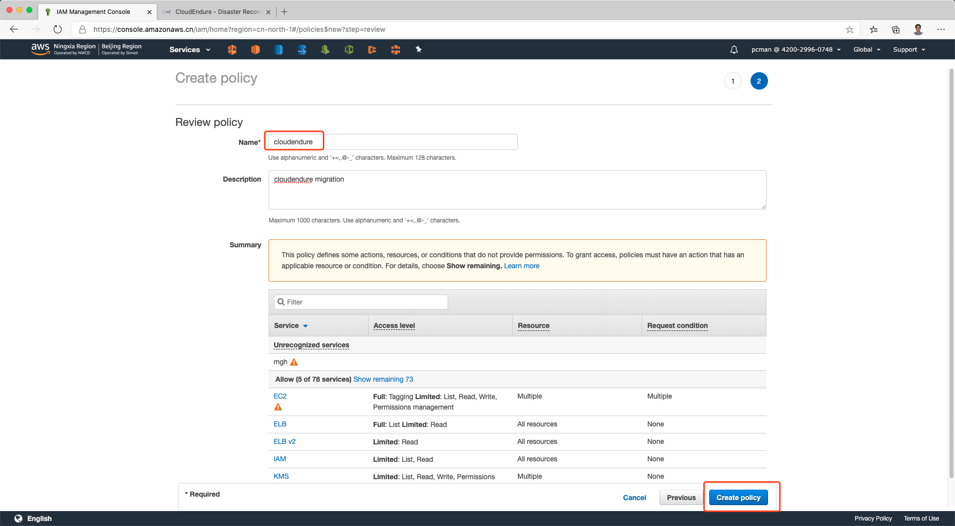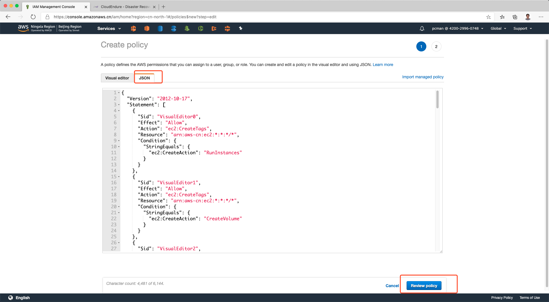 请从这里下载适合AWS中国区域的IAM策略。如下截图中使用的策略与CloudEndure英文官方文档的策略的区别是为中国区IAM增加了aws-cn标识,其他部分与海外英文文档的配置一致。如下截图。