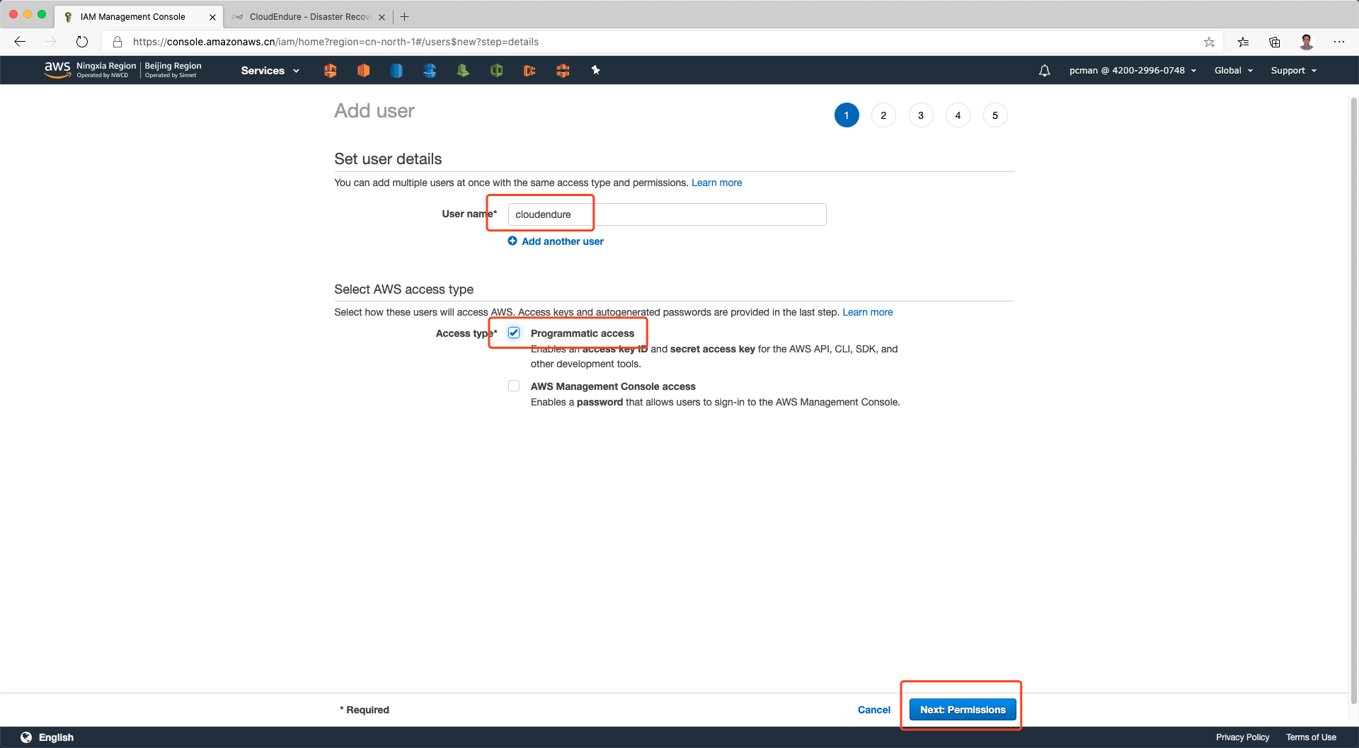 在设置用户名界面,输入cloudendure作为用户名,然后选择“Programmatic access”,近赋予这个用户API访问权限,不提供Console控制台的图形界面登录权限。然后点击下一步继续。如下截图。