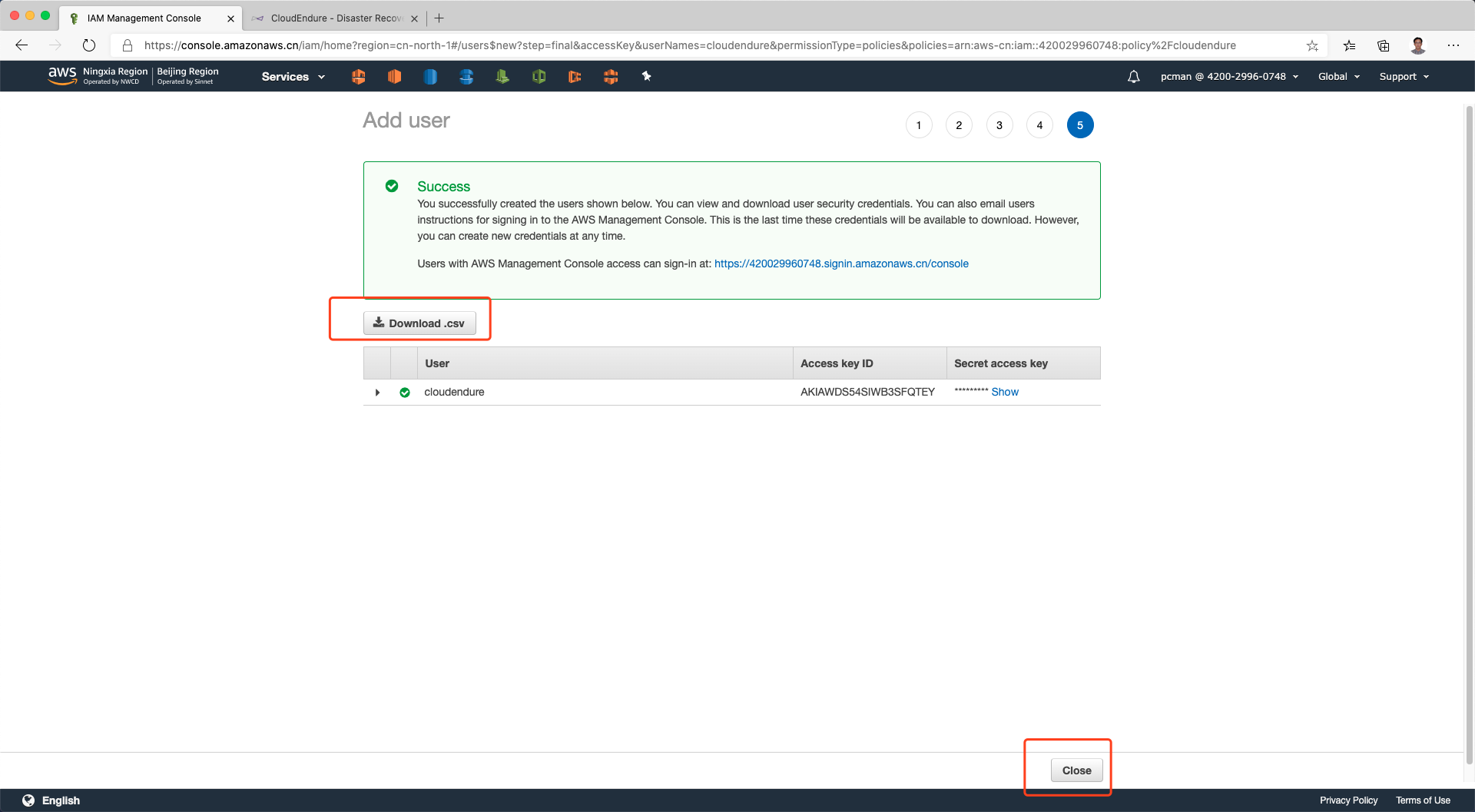 在创建用户的最后一步,点击创建完成创建。此时界面上会生成这个用户的API Access Key和密钥,点击Download.csv下载到本机。
