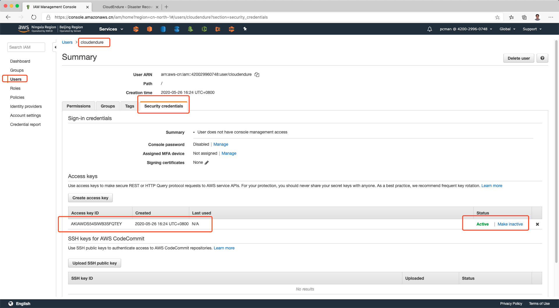 如果使用中需要更换API Access Key和密钥,则可以进入IAM用户界面,找到当前用户,在安全凭证下,可以生成新的Key。如下截图。