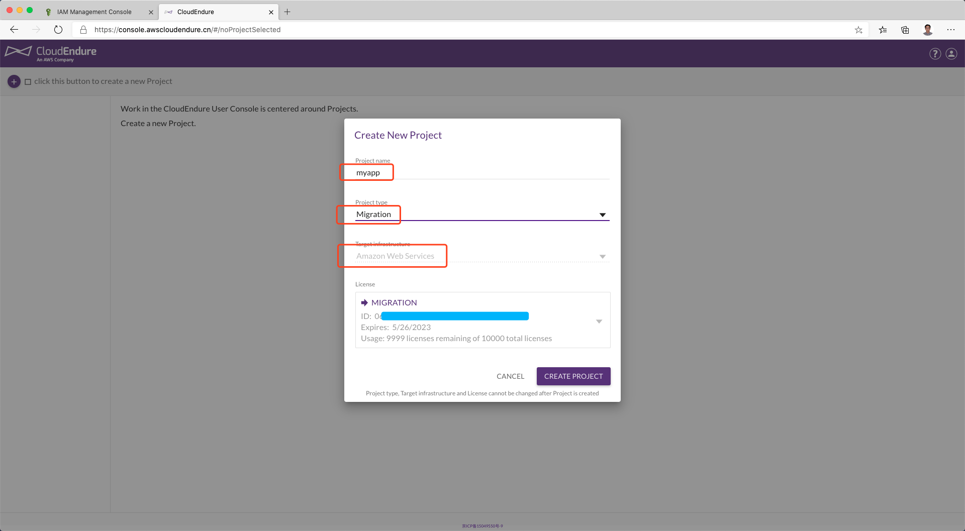 在创建项目界面,输入Project名称,例如myapp,选择Project Type为“Migration”。这里注意不通的Project Type会涉及到不同的License类型。如果是迁移上AWS,必须将类型选择为Migration。然后在Target Infrastructure位置将自动显示为AWS。点击 Create Project 继续。