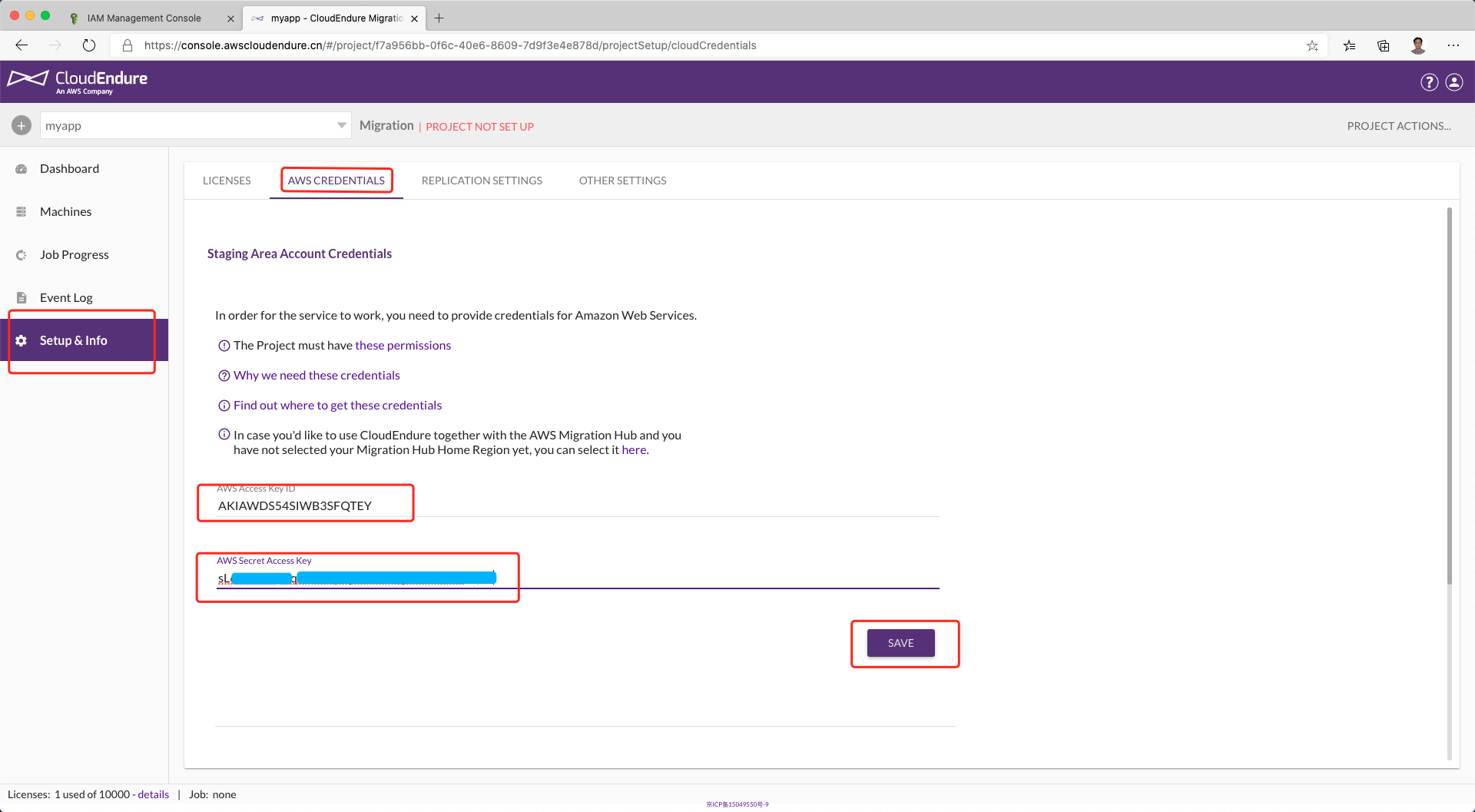 在向导的第一步,要求设置API Access Key。在Setup & Info界面下的Credentials标签页下,输入前文生成的 API密钥,并点击保存。如下截图。