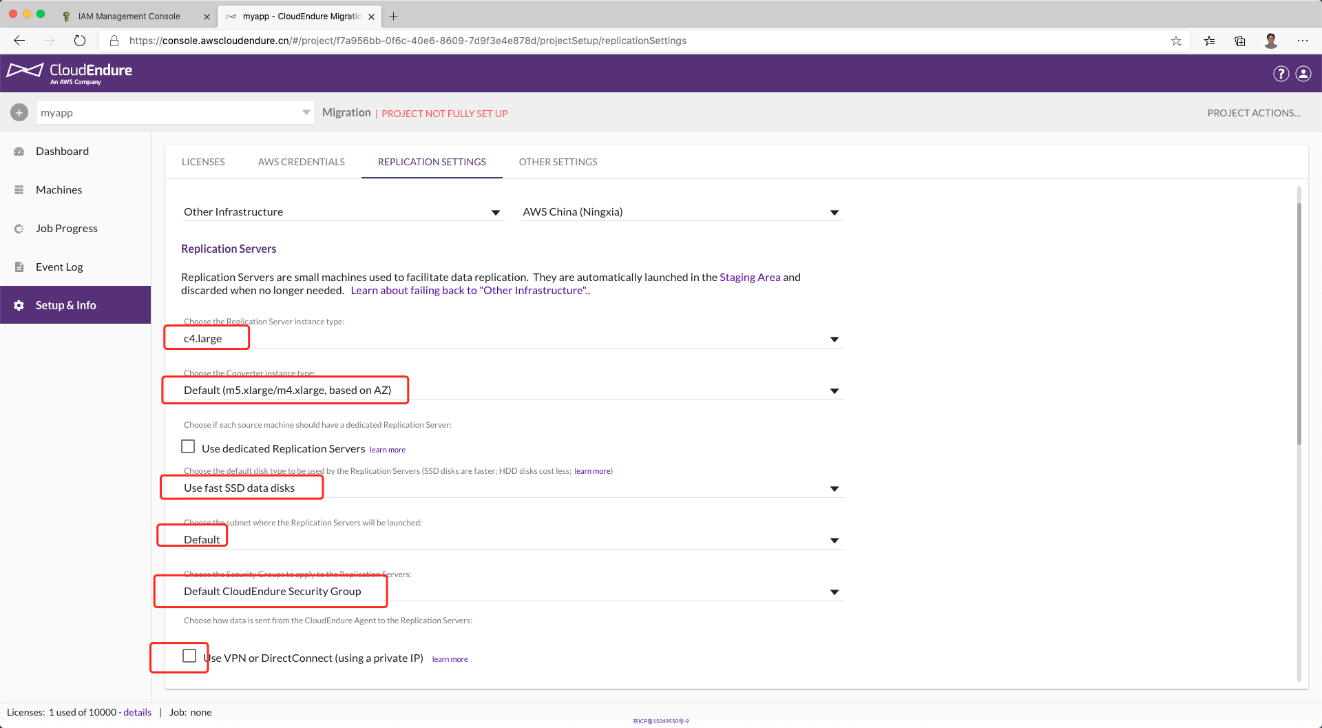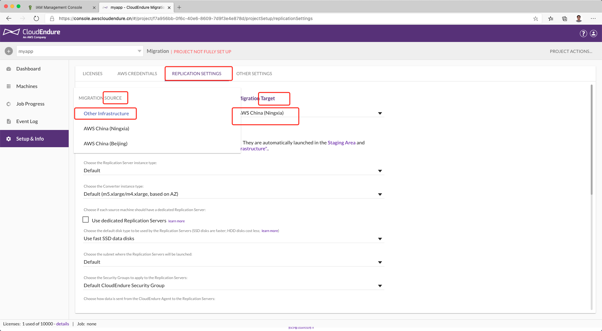 接下来向导自动跳转到Replication Setting界面,在Source选项中,选择要迁移的原始环境是Other Infrastructure,即非AWS的基础设施。然后在target选项中,选择要迁移使用的AWS Region,本文选择宁夏区域(ZHY)。如下截图。