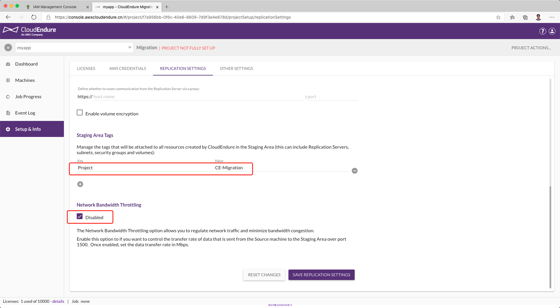继续向下滚动页面,在页面最下方,设置迁移实例使用的标签(tag),这样便于区分。此外,带宽限制根据实际情况,可以选择Disable(不限制带宽),或者限制在1Mbps~10Gbps之间。建议最低提供50Mbps以上,否则迁移速度过慢,可能导致一直无法同步完成。如下截图。