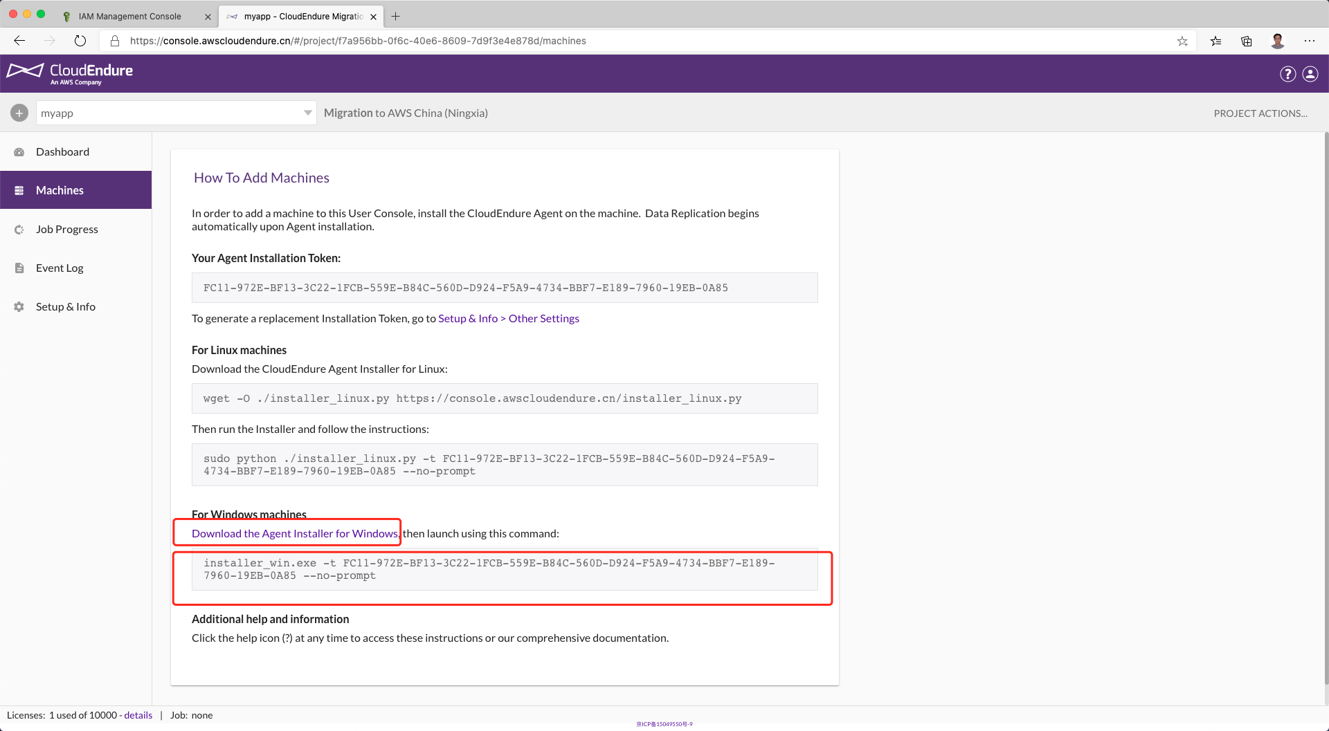 在前文完成了CloudEndure项目配置后,系统将来到Machines界面。页面右侧将提示本次迁移的Agent下载地址和认证码。如下截图。