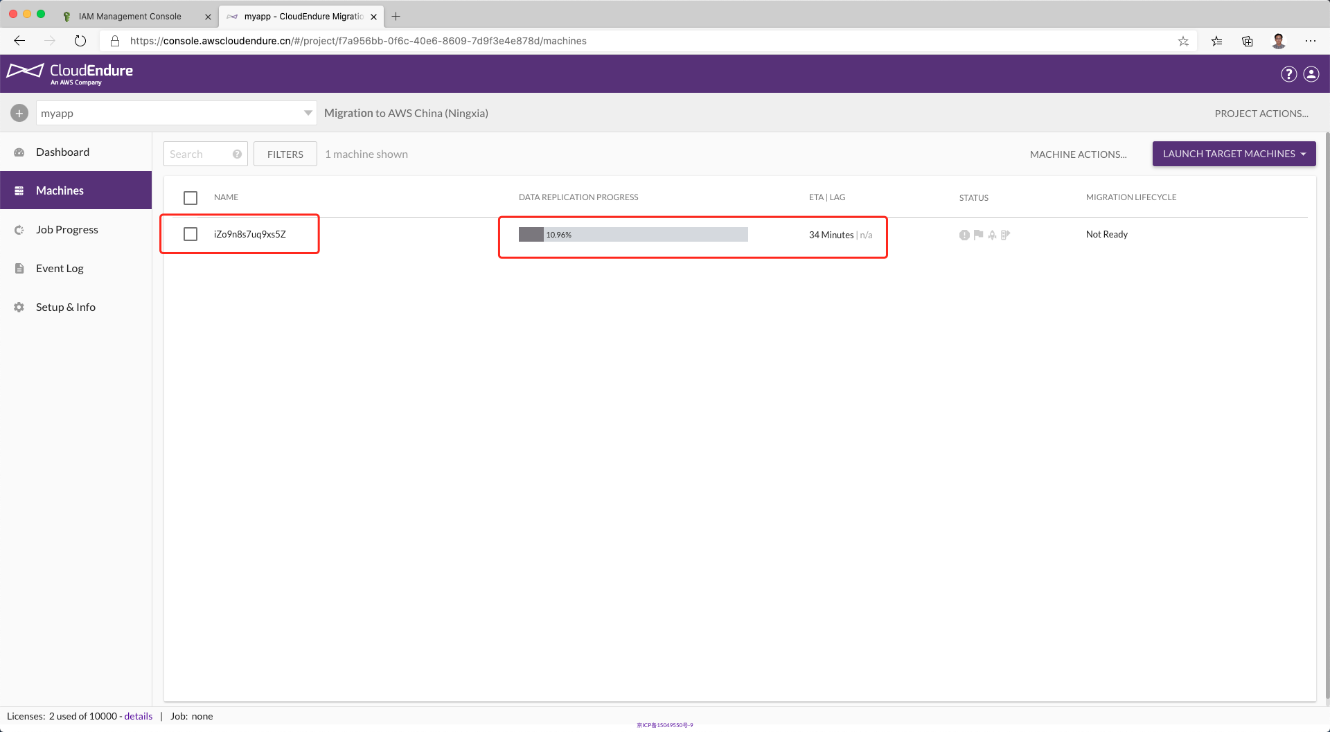 现在返回CloudEndure,可以看到CloudEndure控制台提示发现了一台要迁移的机器,并且将自动进入首次全量数据复制阶段。