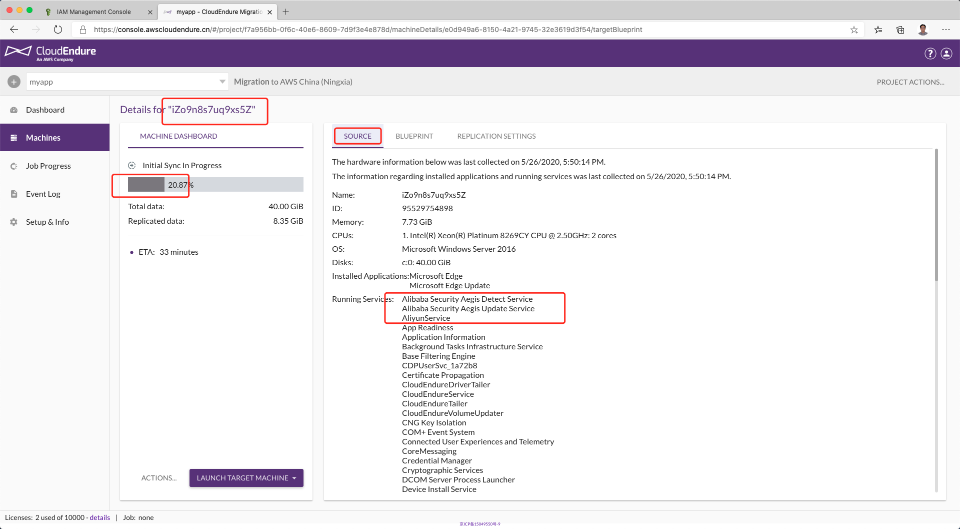 在CloudEndure的Machine界面上,点击机器的名字,即可进入详情界面。进入详情界面后,点击标签页Source,即可看到源虚拟机的信息。例如本文档迁移的机器是阿里云上的ECS云服务器,因此在系统服务中,可以看到阿里云安骑士杀毒软件的后台服务。如下截图。