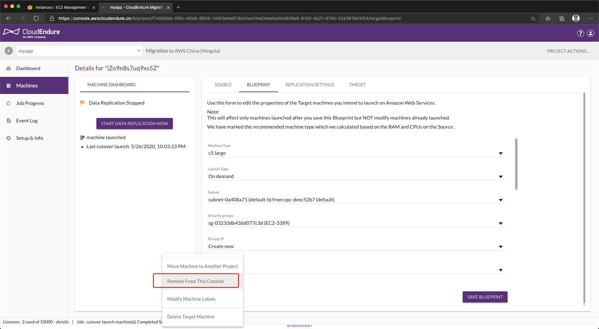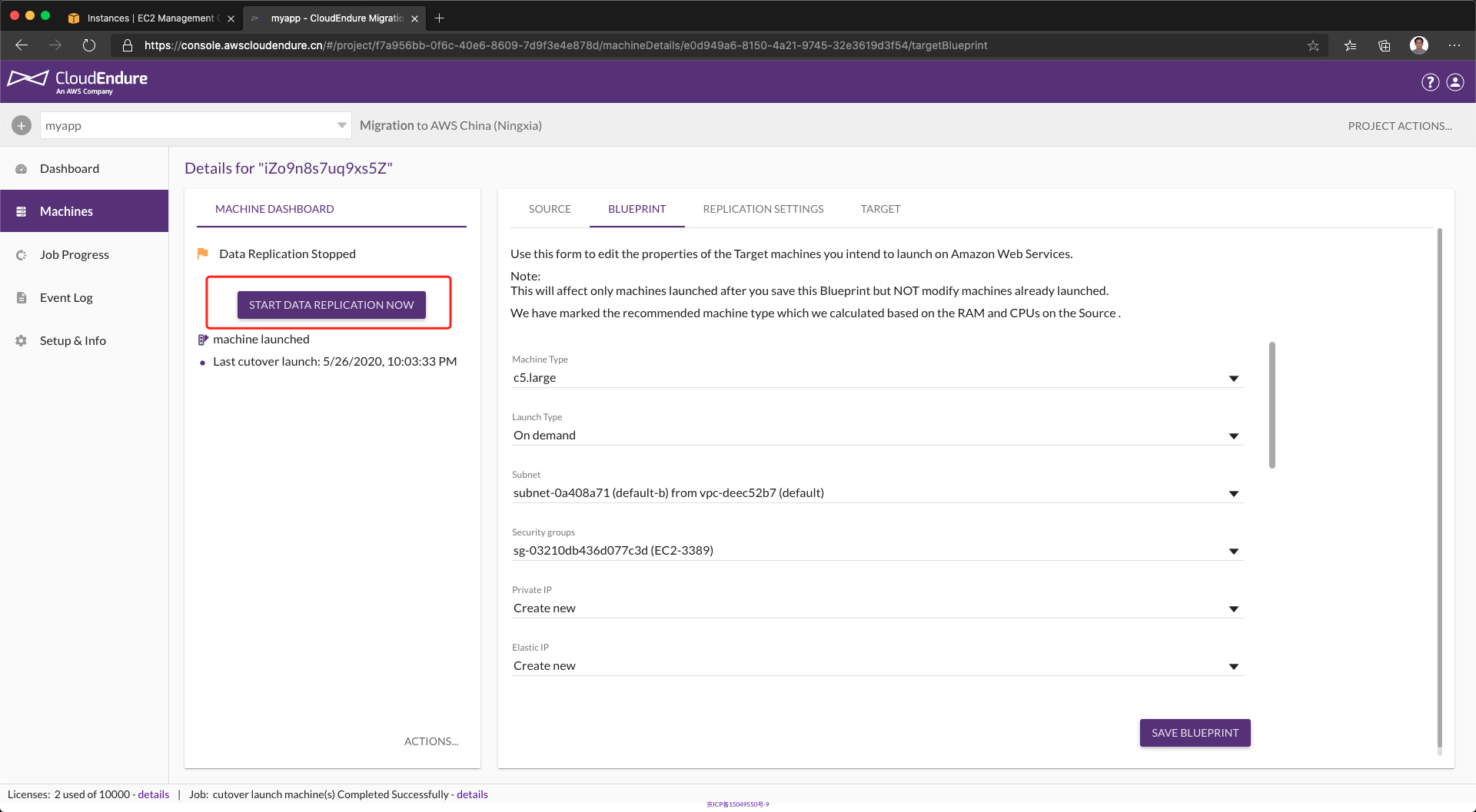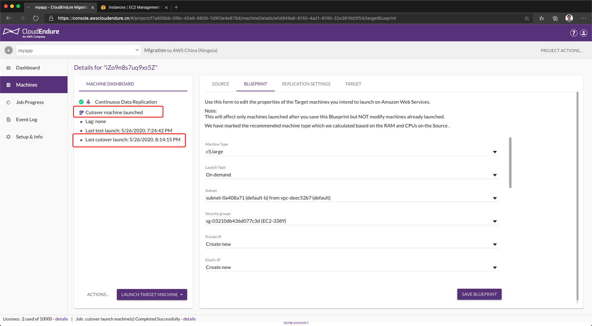 - 请不要通过AWS EC2控制台对本实例做配置变更,如果需要调整EC2型号和配置,或者调整网络设置,请到CloudEndure界面,修改本云服务器对应的蓝图(Blueprint),然后在CloudEndure上启动新的测试实例。