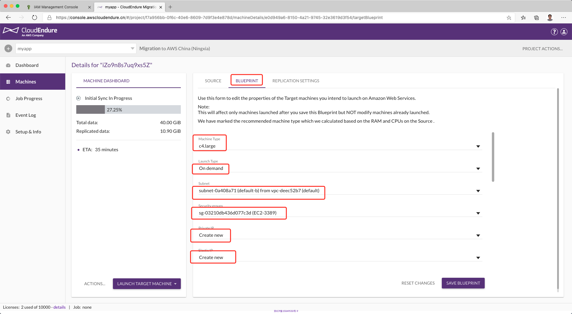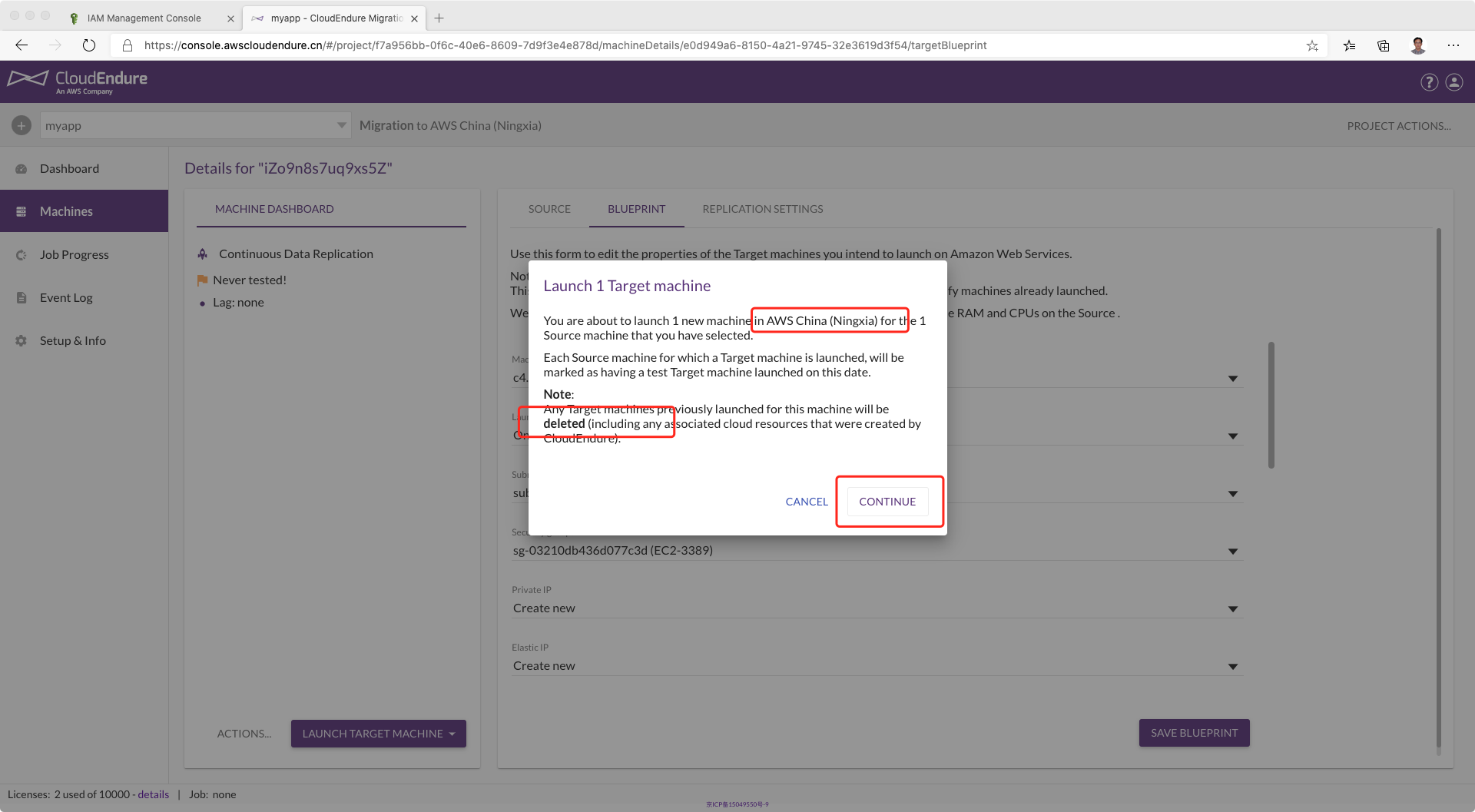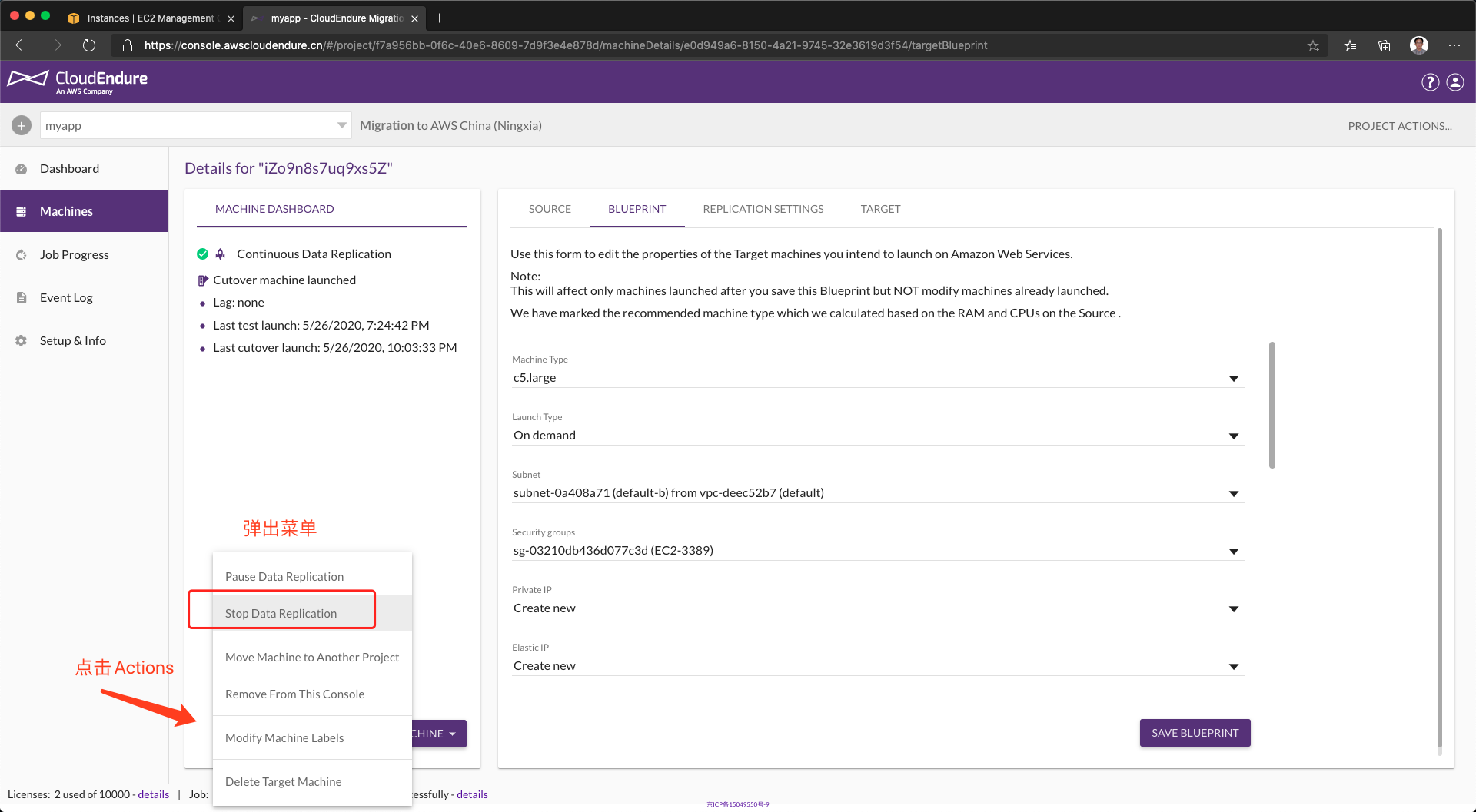 - 请不要通过AWS EC2控制台对本实例做配置变更,如果需要调整EC2型号和配置,或者调整网络设置,请到CloudEndure界面,修改本云服务器对应的蓝图(Blueprint),然后在CloudEndure上启动新的测试实例。
