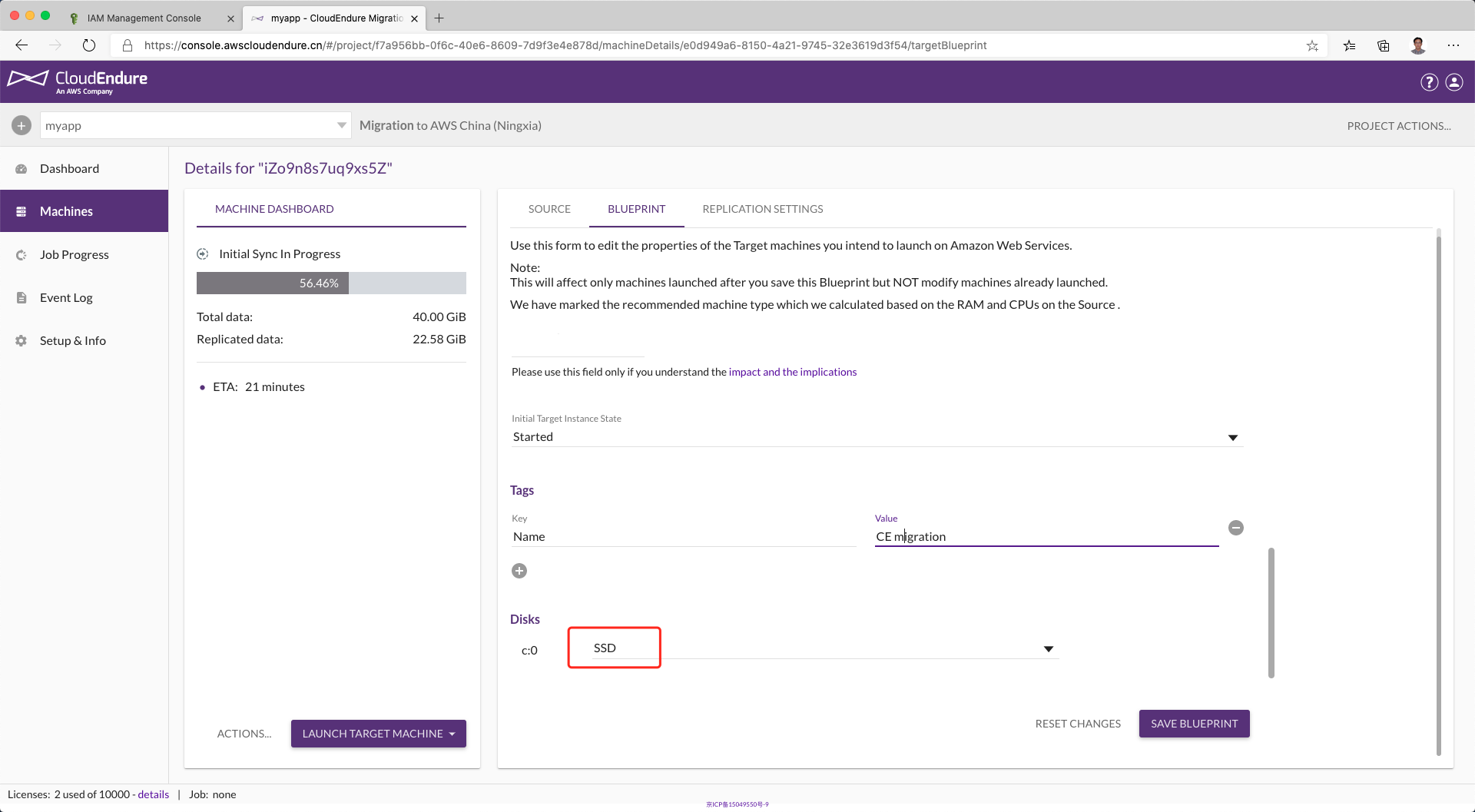 在如上截图的两个EC2中,第一个名为Replication Server的是负责全量数据复制和增量数据复制的复制实例。这个实例会一直存在本AWS区域内,知道CloudEndure上的项目(Project)被删除。另一个实例叫做Machine Converter,这个实例是完成全量复制后,启动Test环境或者启动最终生产环境过程中的一个中间实例。这个实例将用于从全量复制和增量复制的时间点生成磁盘快照。在环境启动完成后,这个Converter实例会自动把自己删除。下次需要转换时候会自动再启动和出现完成转换。