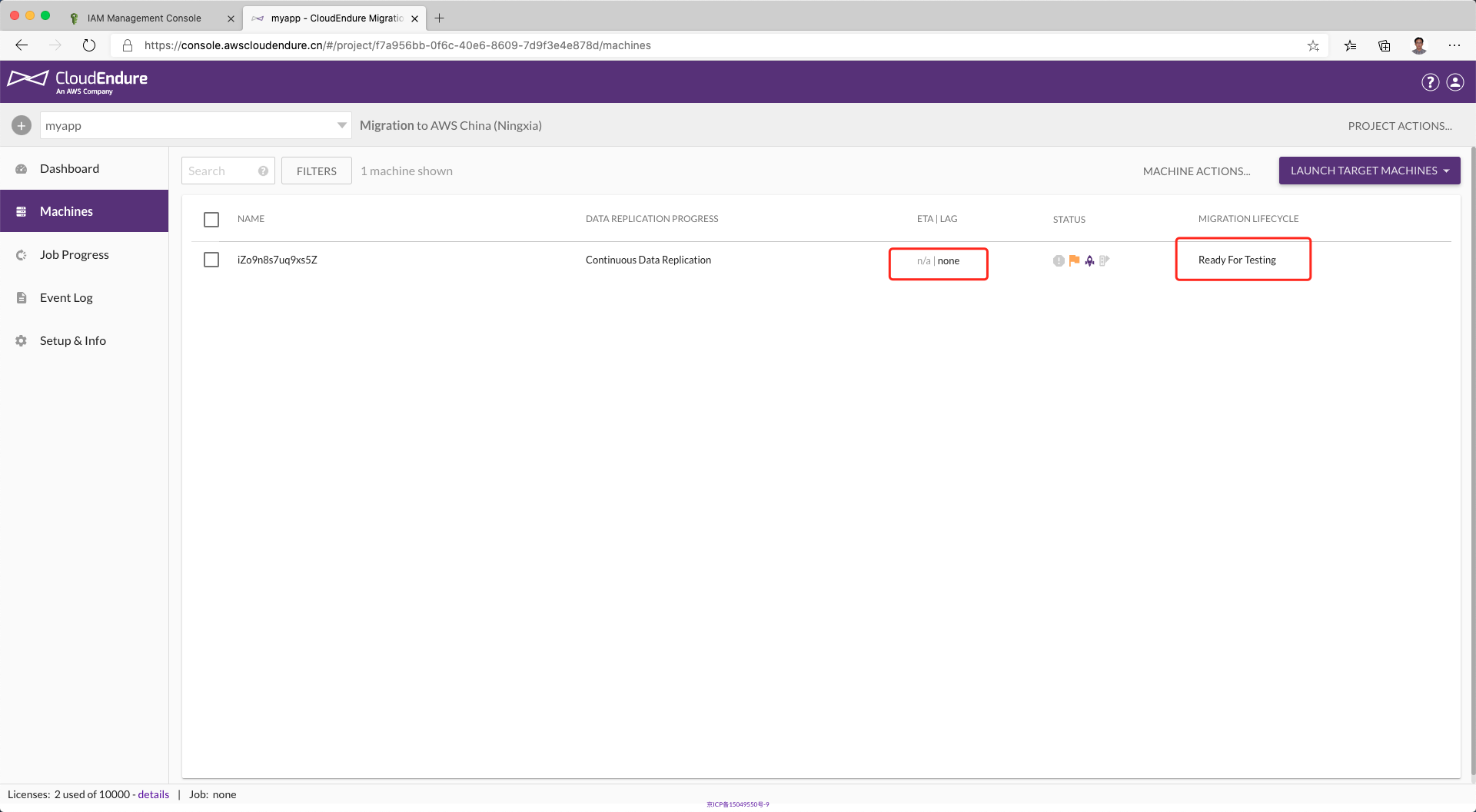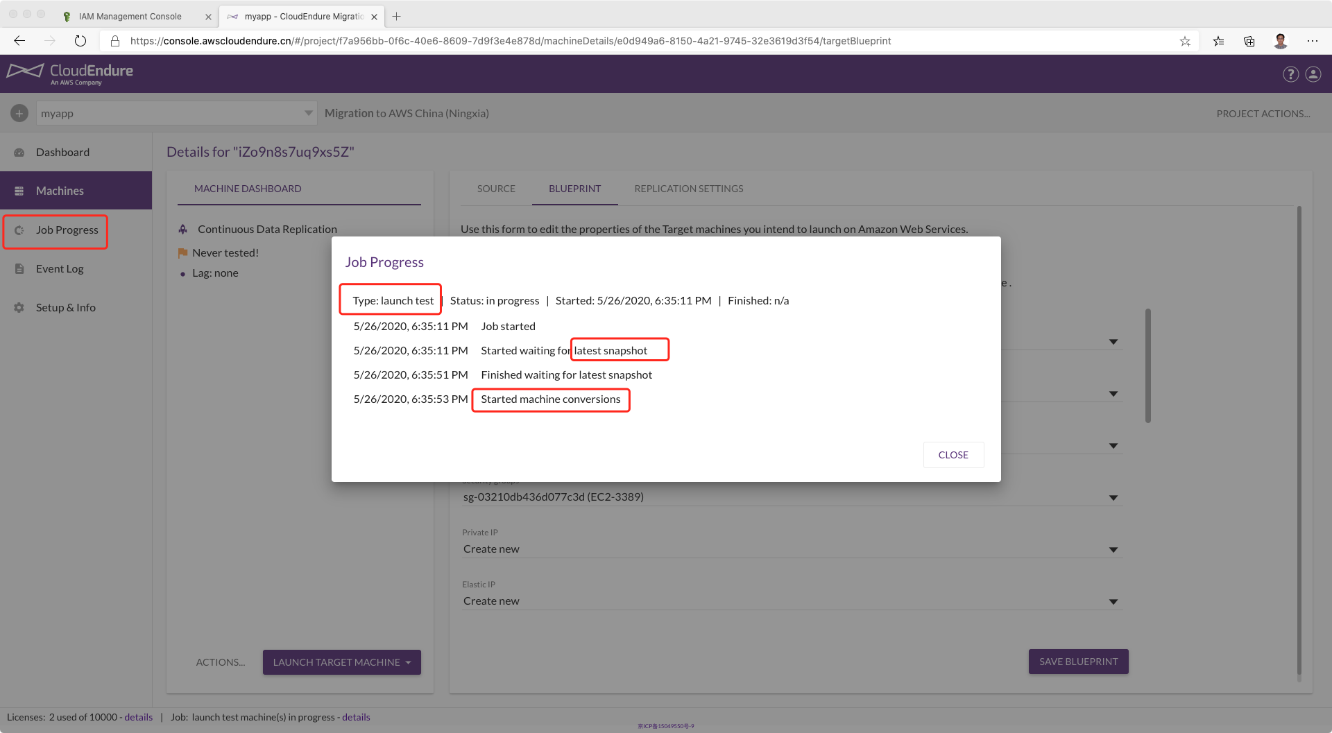 在点击了继续按钮后,CloudEndure将花费数分钟,从当前数据持续复制的状态中生成一个时间点,完成一份快照,然后将这个时间点的快照作为测试环境的系统盘,启动一个新的EC2,交付测试。此时可以点击左侧的Job Progress按钮,即可看到系统后台的任务正在进行快照和虚拟机转换。如下截图。