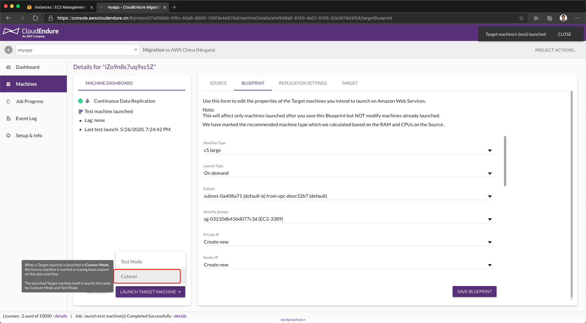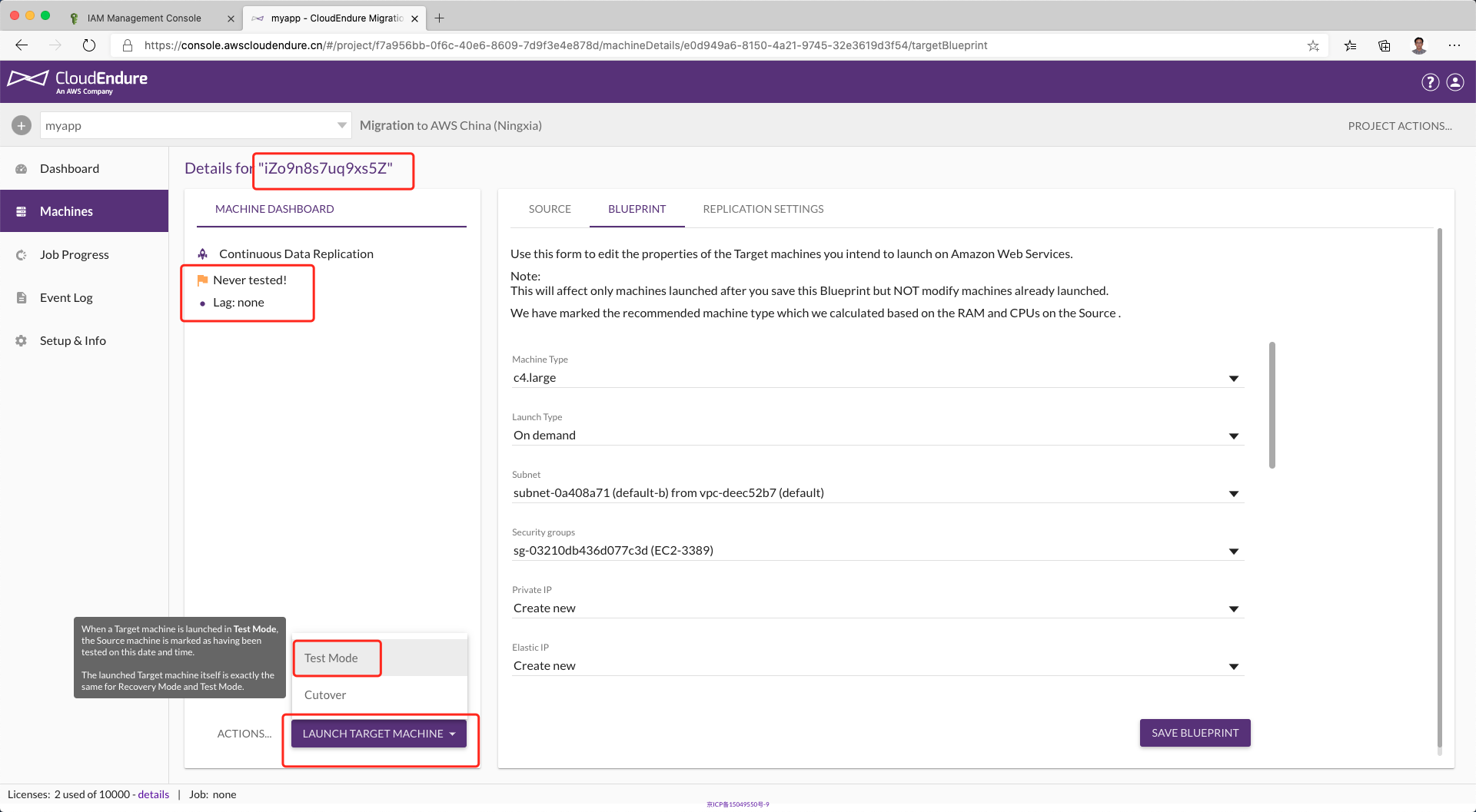 点击Launch按钮,在弹出的狂中选择“Test Mode”,即可为本次迁移的云服务器在AWS上生成测试用EC2(也就是所谓Staging环境)。如下截图。