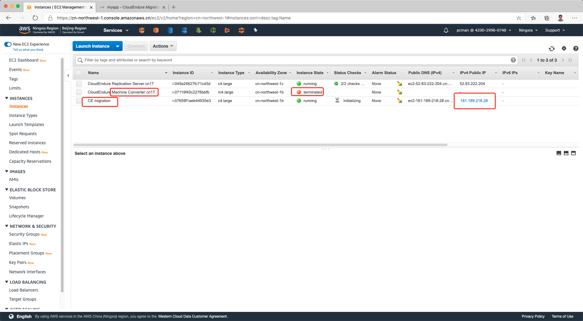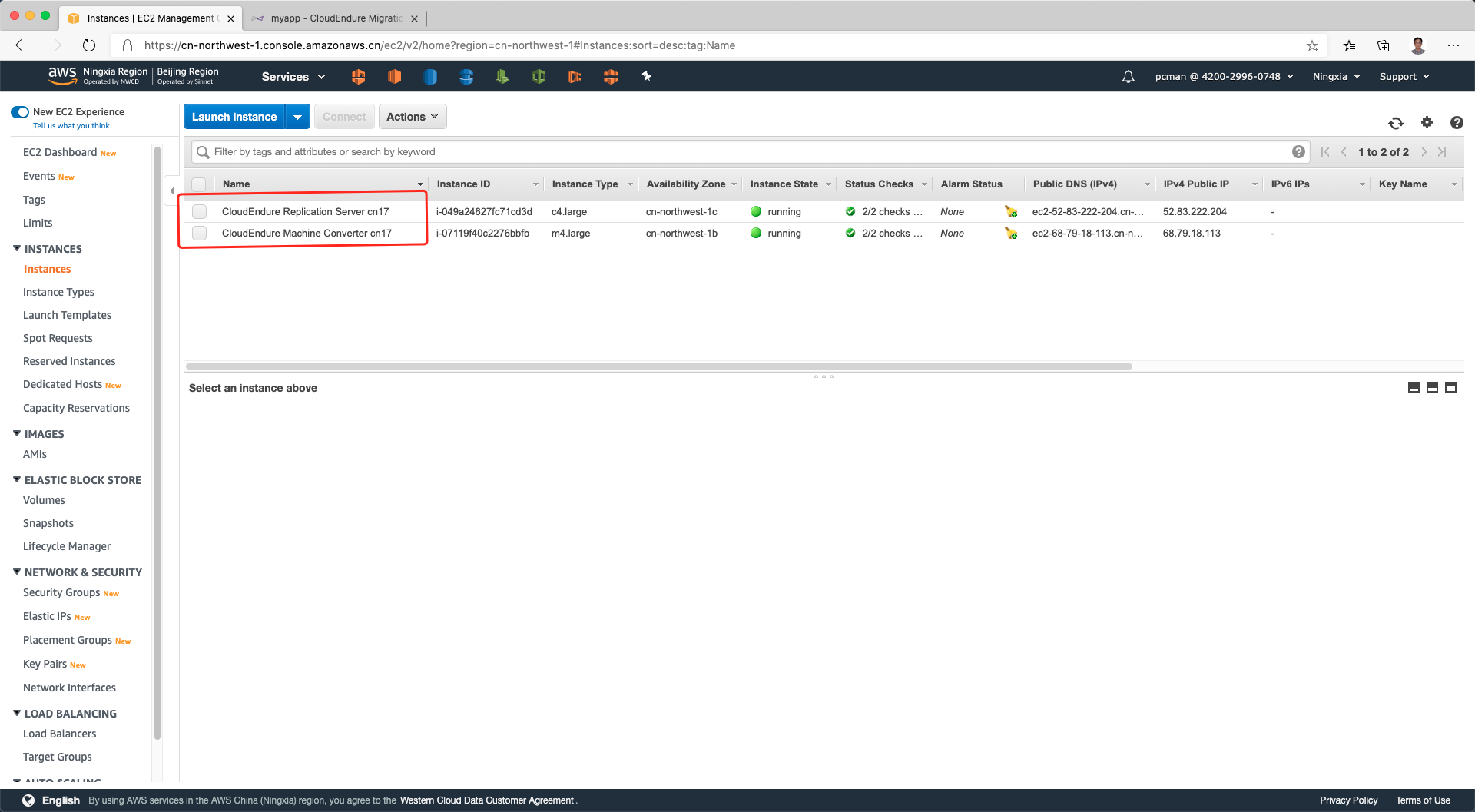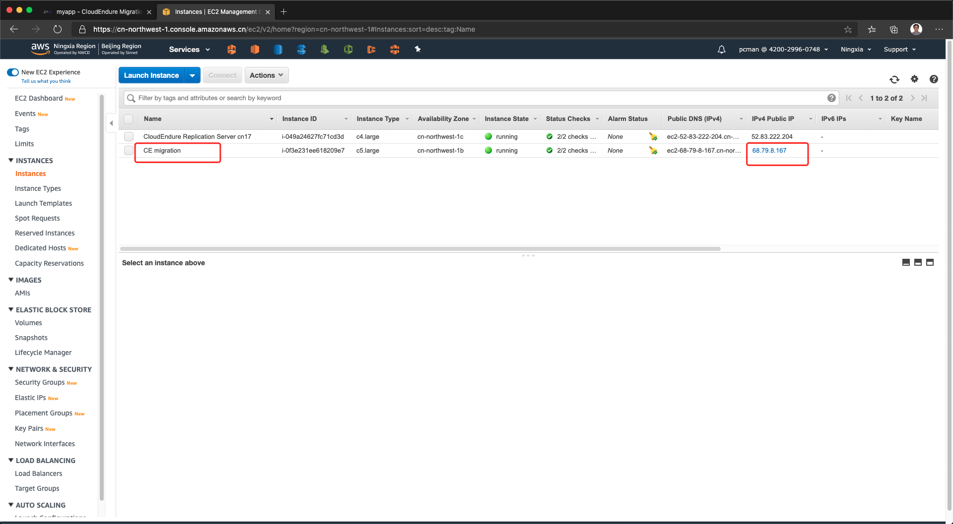 现在进入AWS控制台,选择本次迁移的目标区域宁夏区域,查看EC2清单,可以看到有两台EC2。如下截图。