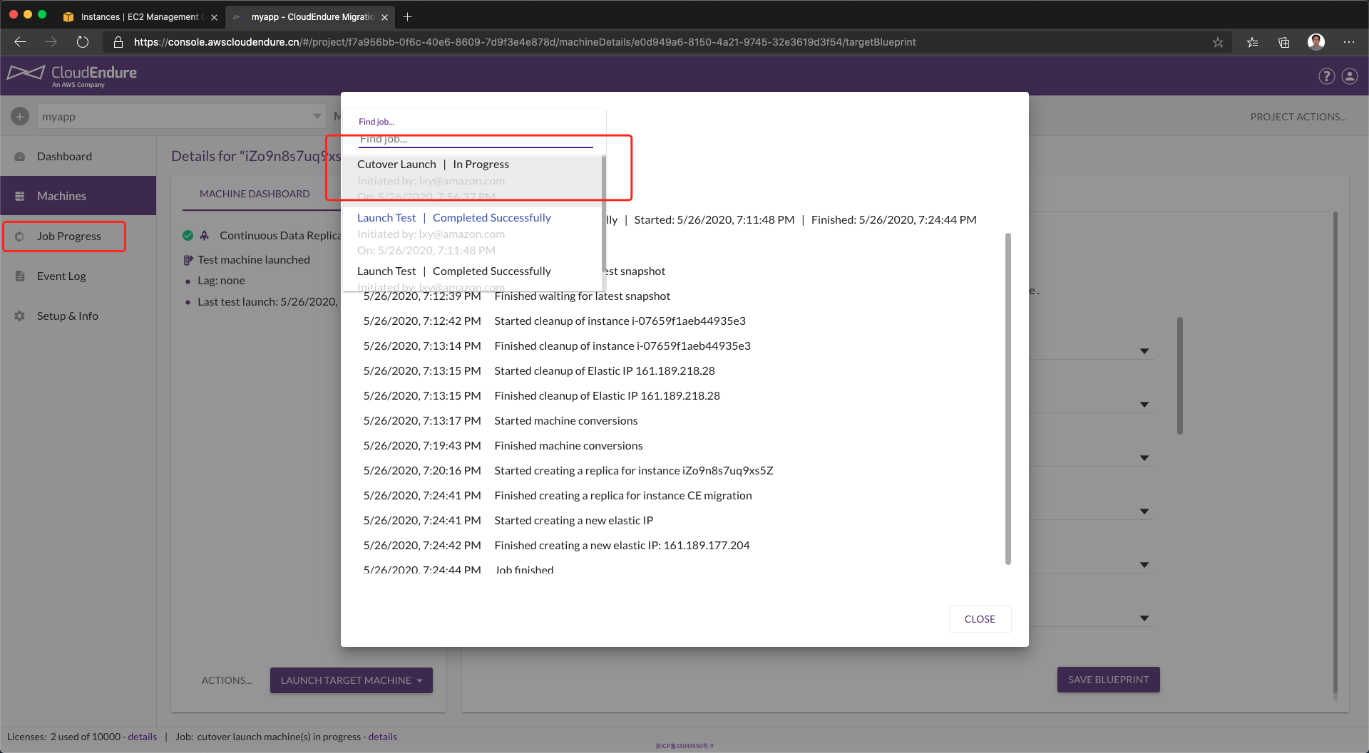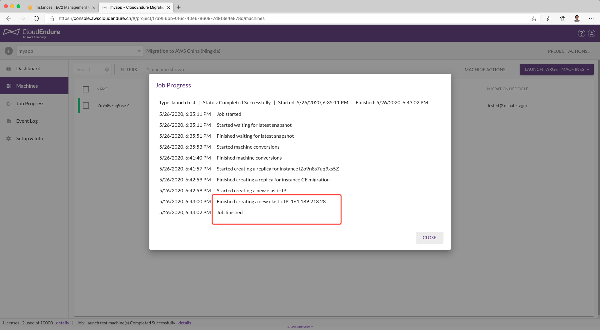 现在回到CloudEndure控制台,查看Job Progress,可以看到通过快照生成测试环境的任务已经完成,如下截图。