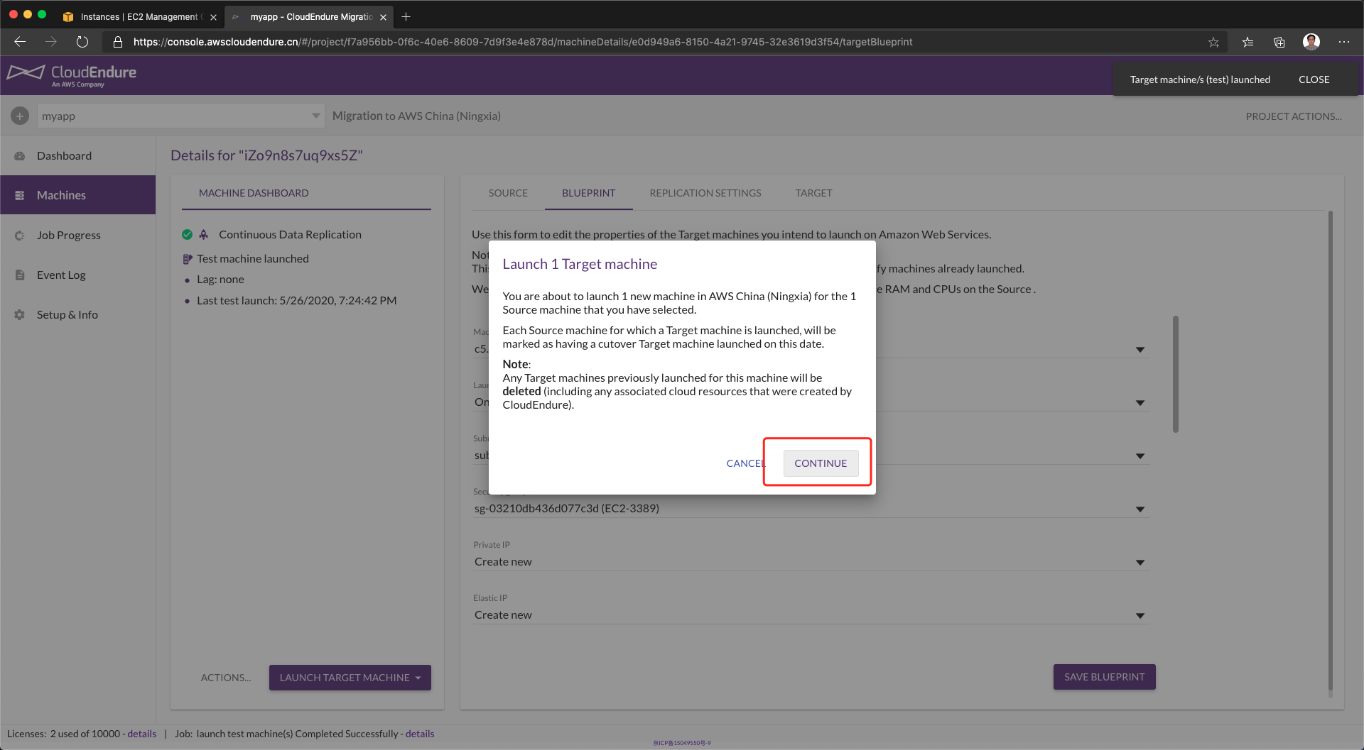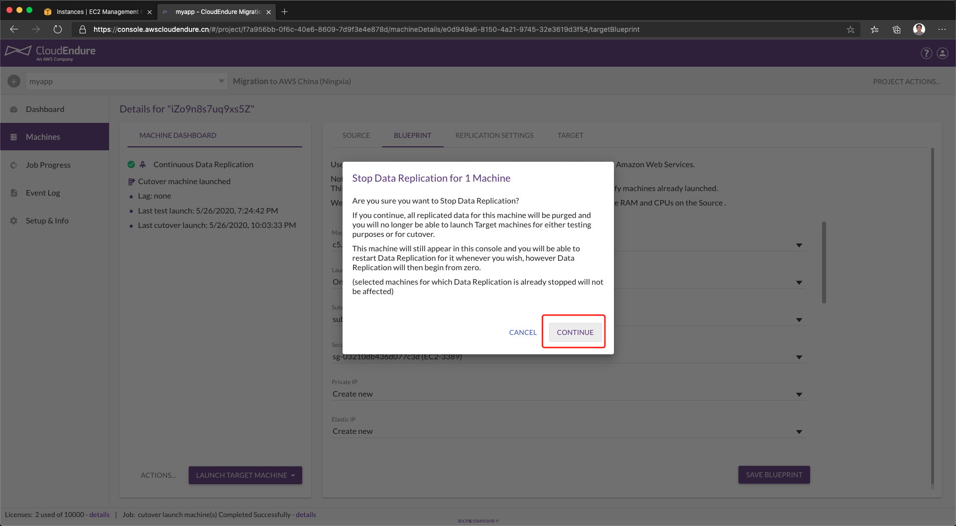 在提示的对话框中选择Continue。此时本实例对应的测试实例将被自动关闭,将在Cutover时刻生成快照,运行最终切换的生产环境的实例。如下截图。
